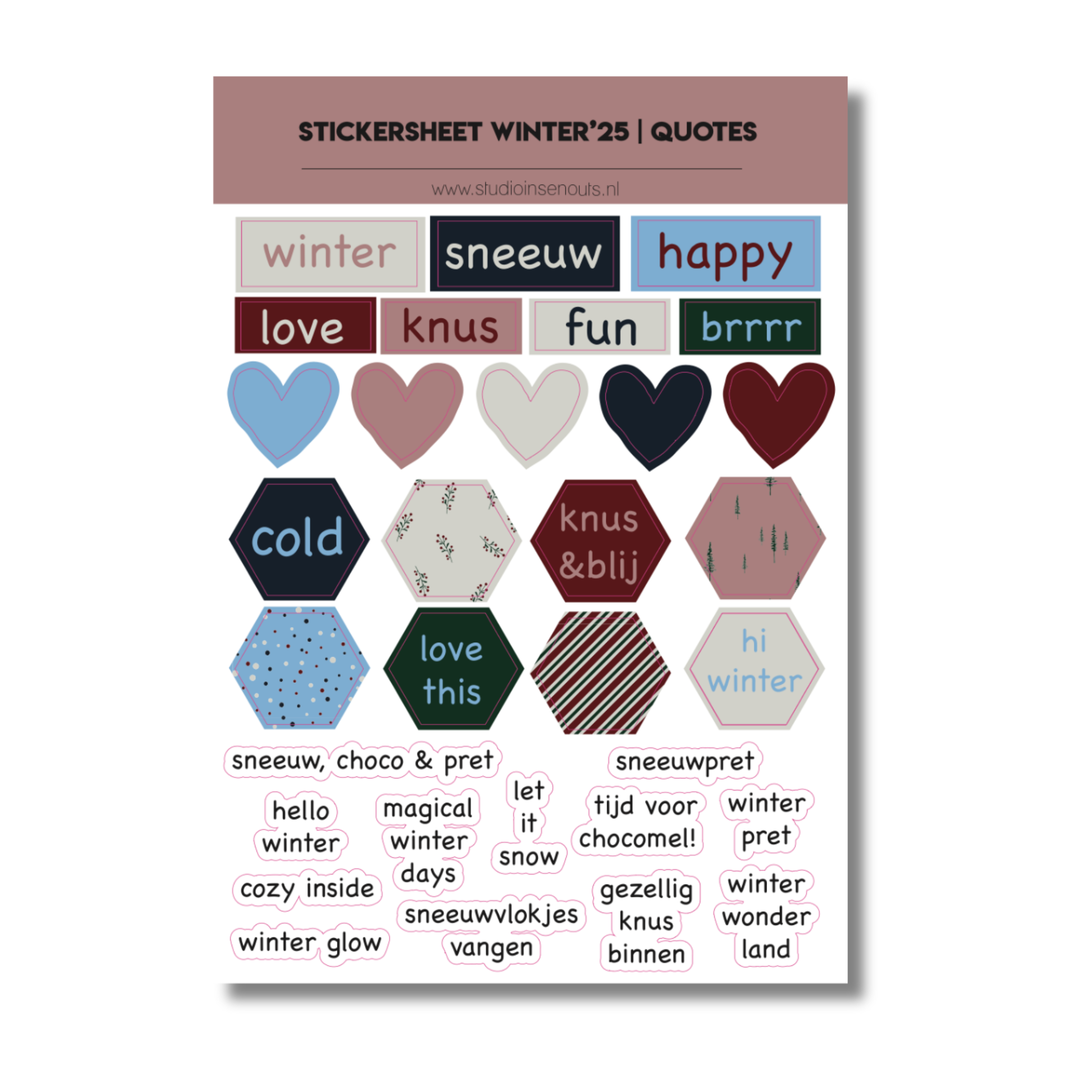 Breng de winterse gezelligheid naar je creatieve projecten met het Stickervel Quotes Winter’25 van Studio Ins & Outs. Dit stickervel bevat 30 sfeervolle tekststickers in koele tinten zoals blauw, bordeaux, donkergroen en zachtgrijs. Ideaal voor gebruik in je scrapbook, journal, planner, invulboek of fotoboek. De combinatie van korte teksten, hartjes en hexagon vormen zorgt voor een knusse uitstraling op elke winterpagina.