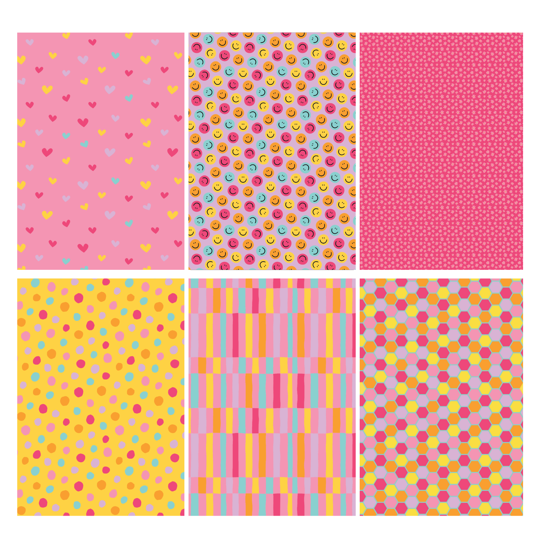De collectie straalt een speelse mix uit van roze, geel, oranje, turquoise en paars. De patronen variëren van lachende smileys en hartjes tot stippen, bloemen, strepen en honingraatjes. Deze frisse en eigentijdse prints maken het eenvoudig om levendige scrapbookpagina’s of creatieve journaling layouts te ontwerpen die meteen in het oog springen.