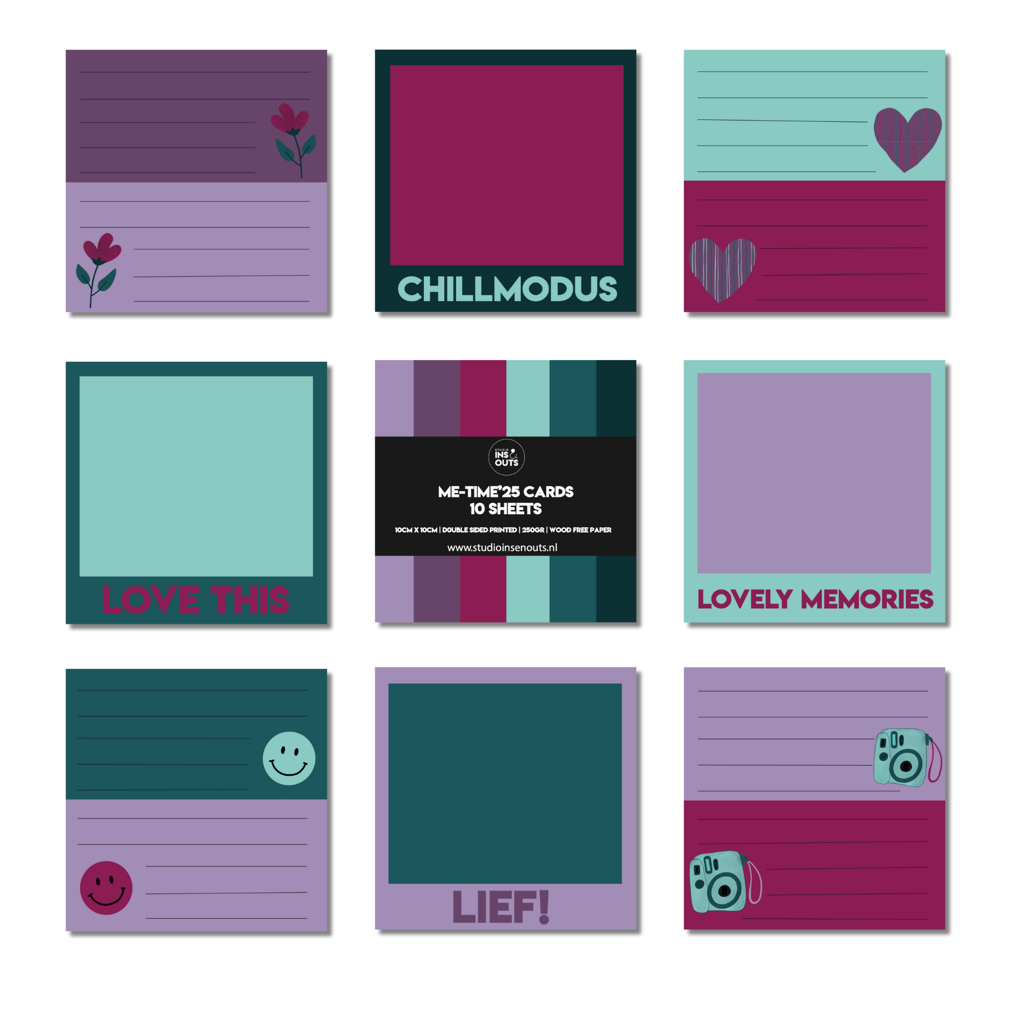 Vrolijke polaroid kaartjes uit de Me-Time’25 collectie van Studio Ins & Outs! Deze set bestaat uit 10 stevige kaartjes van 10x10 cm, perfect om te gebruiken in je invulboek of plakboek om bijzondere momenten vast te leggen, persoonlijke notities te schrijven of creatief aan de slag te gaan in je scrapbook of journal. De ene zijde van elk kaartje bevat fijne schrijflijntjes en een unieke illustratie of quote, zoals “CHILLMODUS”, “LOVE THIS”, “LOVELY MEMORIES” en “LIEF!”. Ook vind je er vrolijke icoontjes zoals bloemen, hartjes, smileys en camera’s. Op de andere zijde is ruimte voor een foto of extra notitie, steeds in een kleurrijk ontwerp. De kleuren die gebruikt worden bij de polaroid kaartjes Me-Time’25 zijn bordeaux, paars, lila, mintgroen, petrol groen en donkergroen.