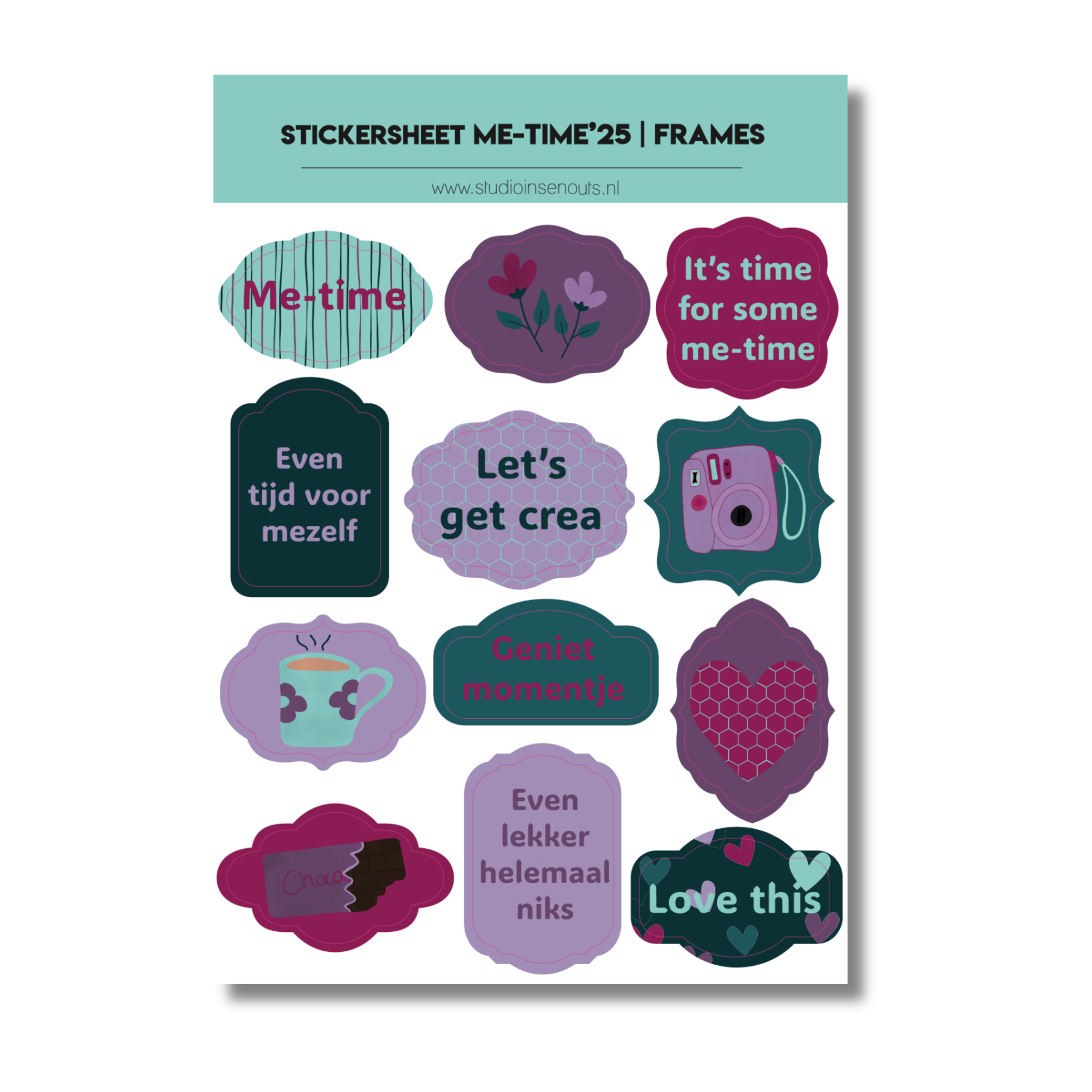Dit stickervel Frames Me-Time 2025 bevat 12 stickers met ontspannende teksten, kleurrijke frames en kleine illustraties in zachte, rustgevende tinten. Op het vel vind je zowel Nederlandse als Engelse teksten, zoals “me-time”, “even tijd voor mezelf”, “let’s get crea”, “geniet momentje”, “even lekker helemaal niks” en “love this”. De stickers zijn aangevuld met illustraties zoals een kopje thee, bloemen, een camera, een hart en een stukje chocola. Voor elke pagina met een moment van rust of creativiteit is er een passende sticker!