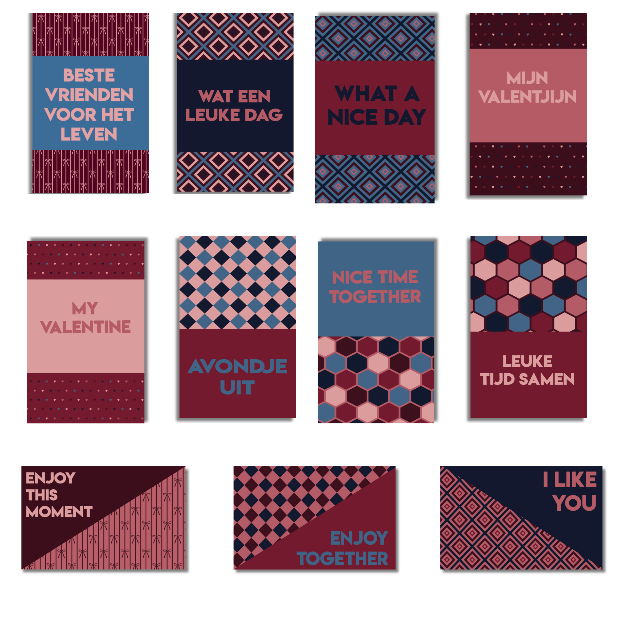 De kaartjes hebben een warme kleurencombinatie van lichtroze, oudroze, rood, bordeaux, blauw en donkerblauw. Door het gebruik van patronen zoals hartjes, strikjes, ruiten, hexagon, hokjes en strepen krijgt de set een herkenbare, maar rustige uitstraling die goed past bij verschillende stijlen.