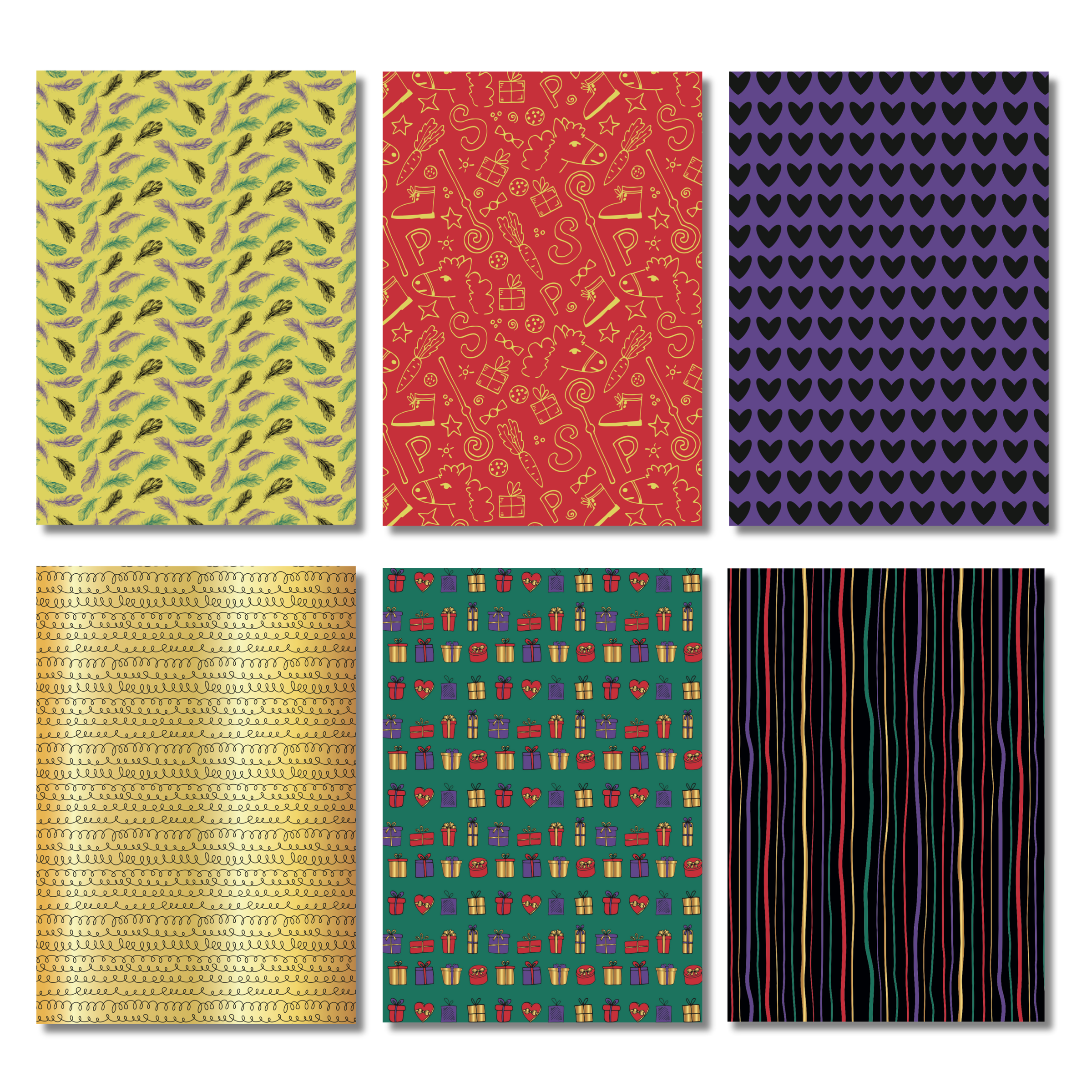 - Patronen: Sinterklaas print, veren, cadeautjes, hartjes, strepen en feestelijke krullen