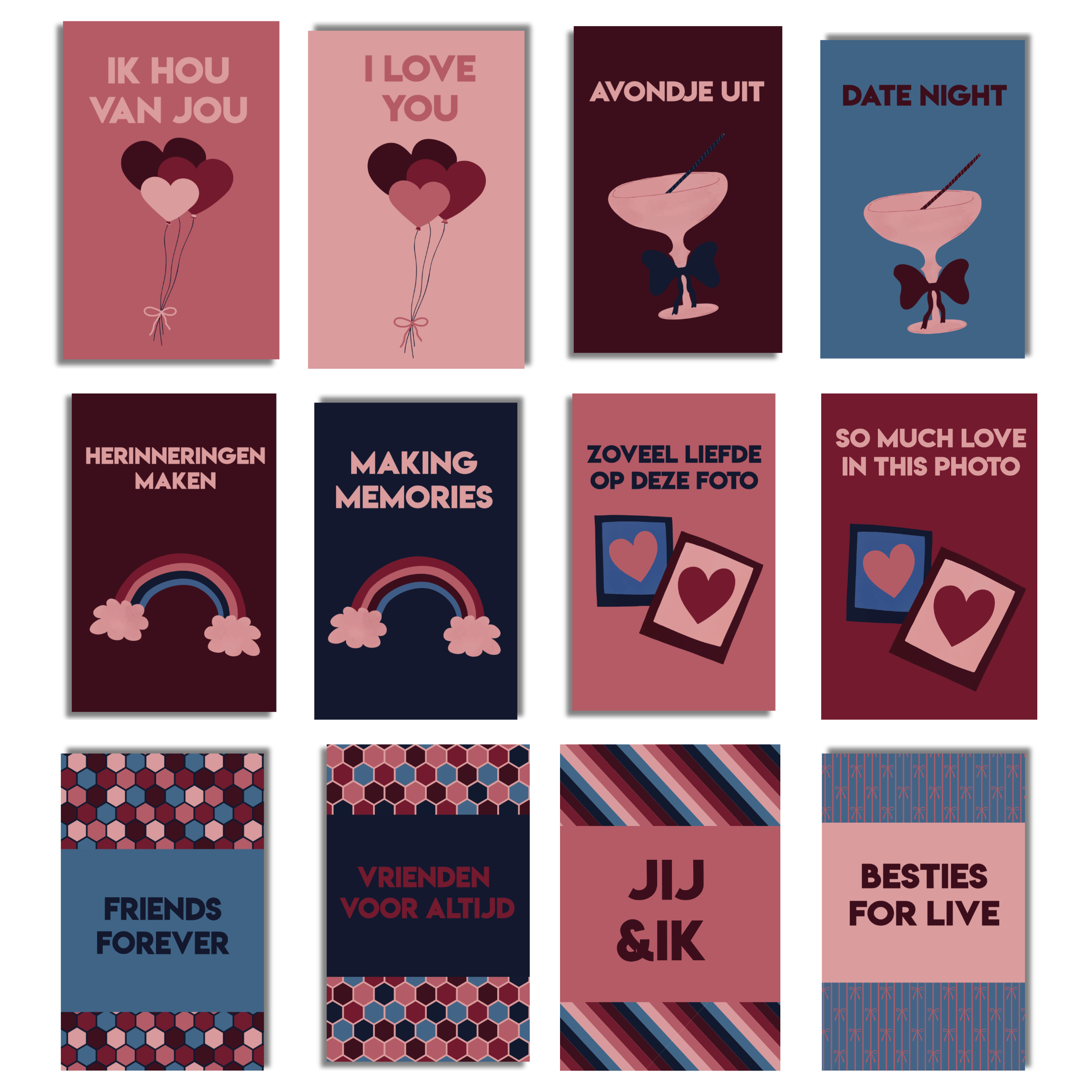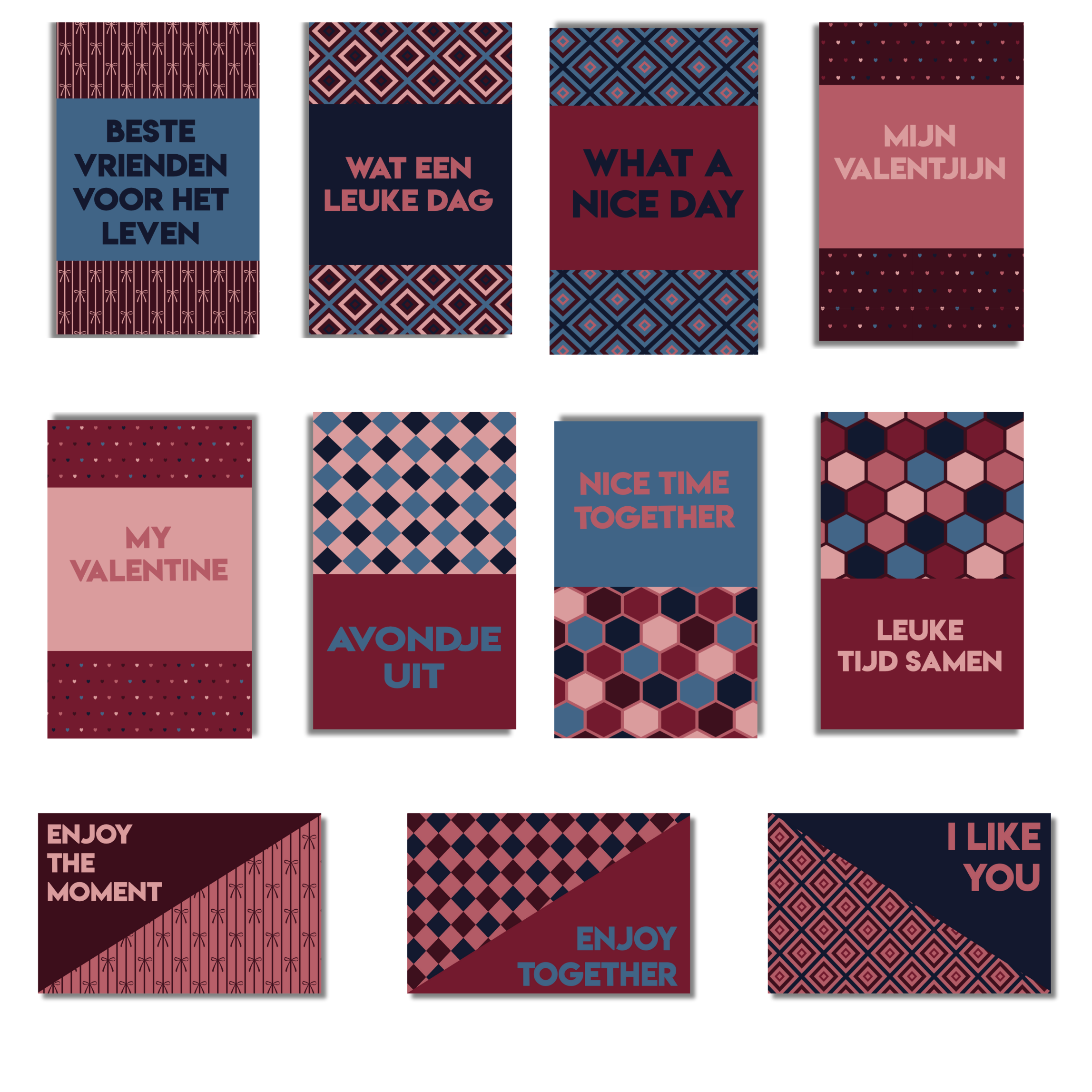 De kaartjes hebben een warme kleurencombinatie van lichtroze, oudroze, rood, bordeaux, blauw en donkerblauw. Door het gebruik van patronen zoals hartjes, strikjes, ruiten, hexagon, hokjes en strepen krijgt de set een herkenbare, maar rustige uitstraling die goed past bij verschillende stijlen.