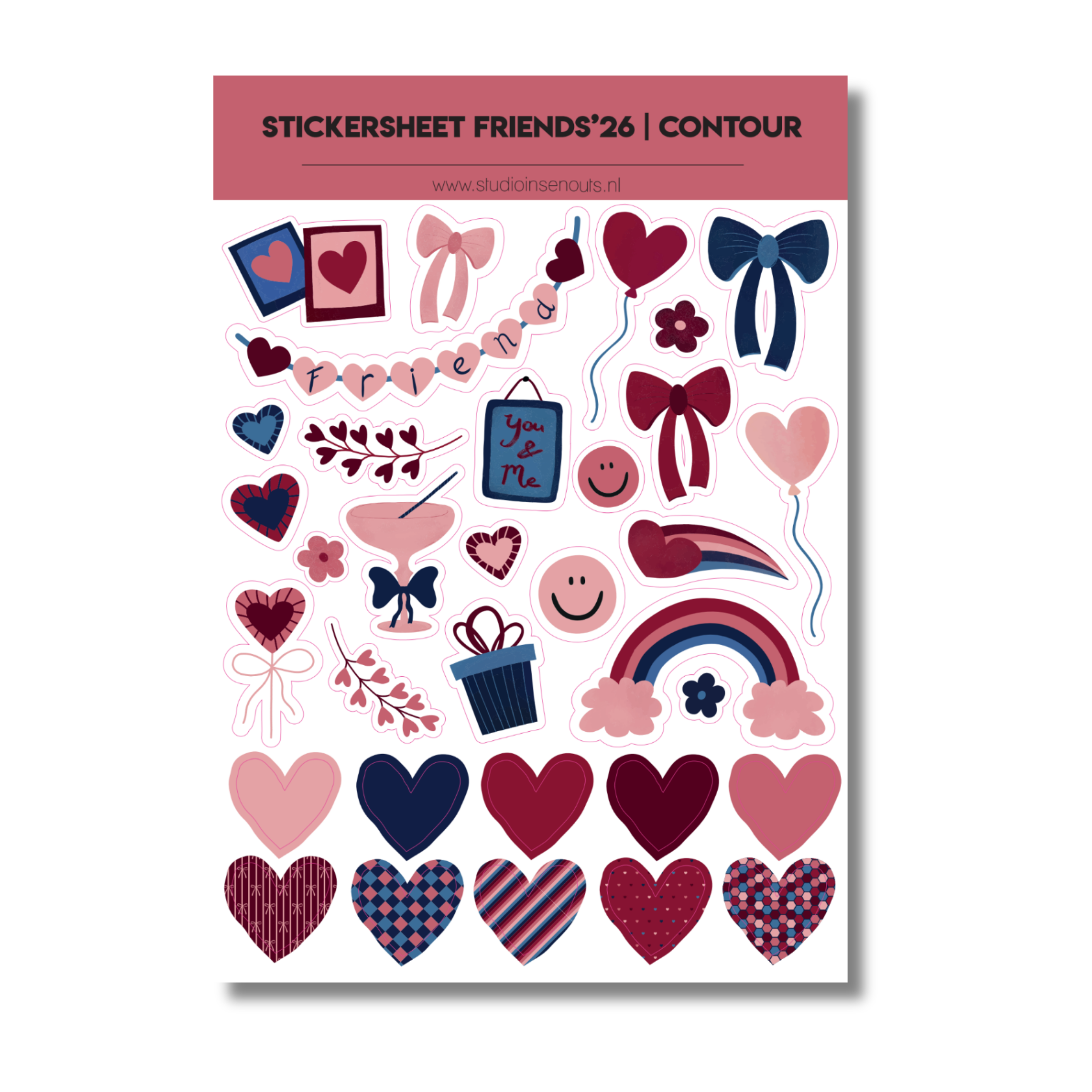 Het Friends ’26 stickervel is uitgevoerd in een warme kleurencombinatie van lichtroze, oudroze, rood, bordeaux, blauw en donkerblauw. De stickers bevatten diverse patronen zoals hartjes, strikjes, ruiten, hexagon, hokjes en strepen. Hierdoor passen ze moeiteloos in allerlei creatieve lay-outs en zijn ze eenvoudig te combineren met andere collecties van Studio Ins & Outs.