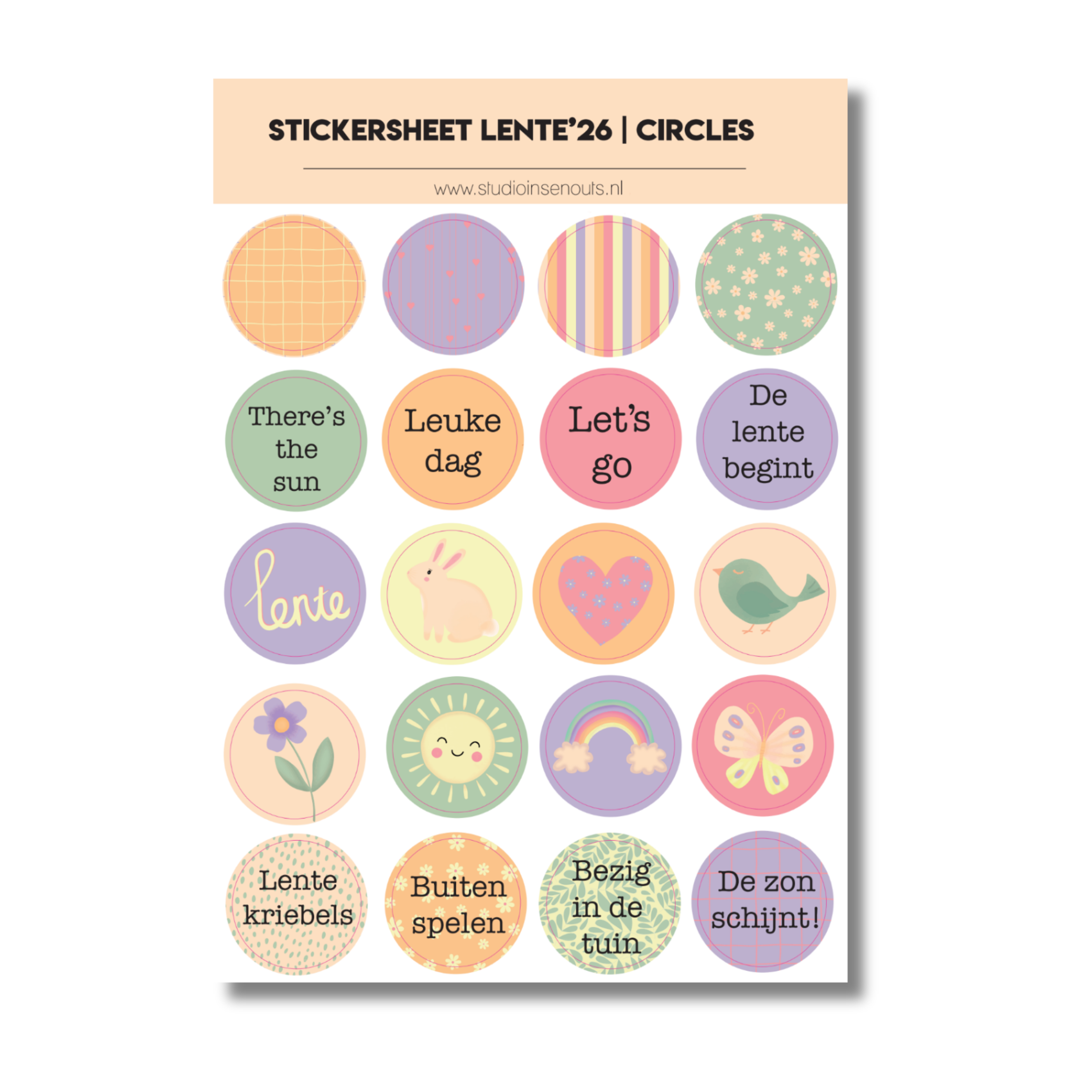 Het Stickervel Circles Lente’26 van Studio Ins & Outs is ontworpen voor gebruik in scrapbooks, fotoalbums, invulboeken en journals. Het stickervel bevat ronde stickers in zachte pastelkleuren zoals crème, pastelgeel, perzik, lichtroze, lila en zachtgroen. De stickers hebben rustige patronen, lieve illustraties en korte lenteteksten, passend bij lente- en Paasthema’s.