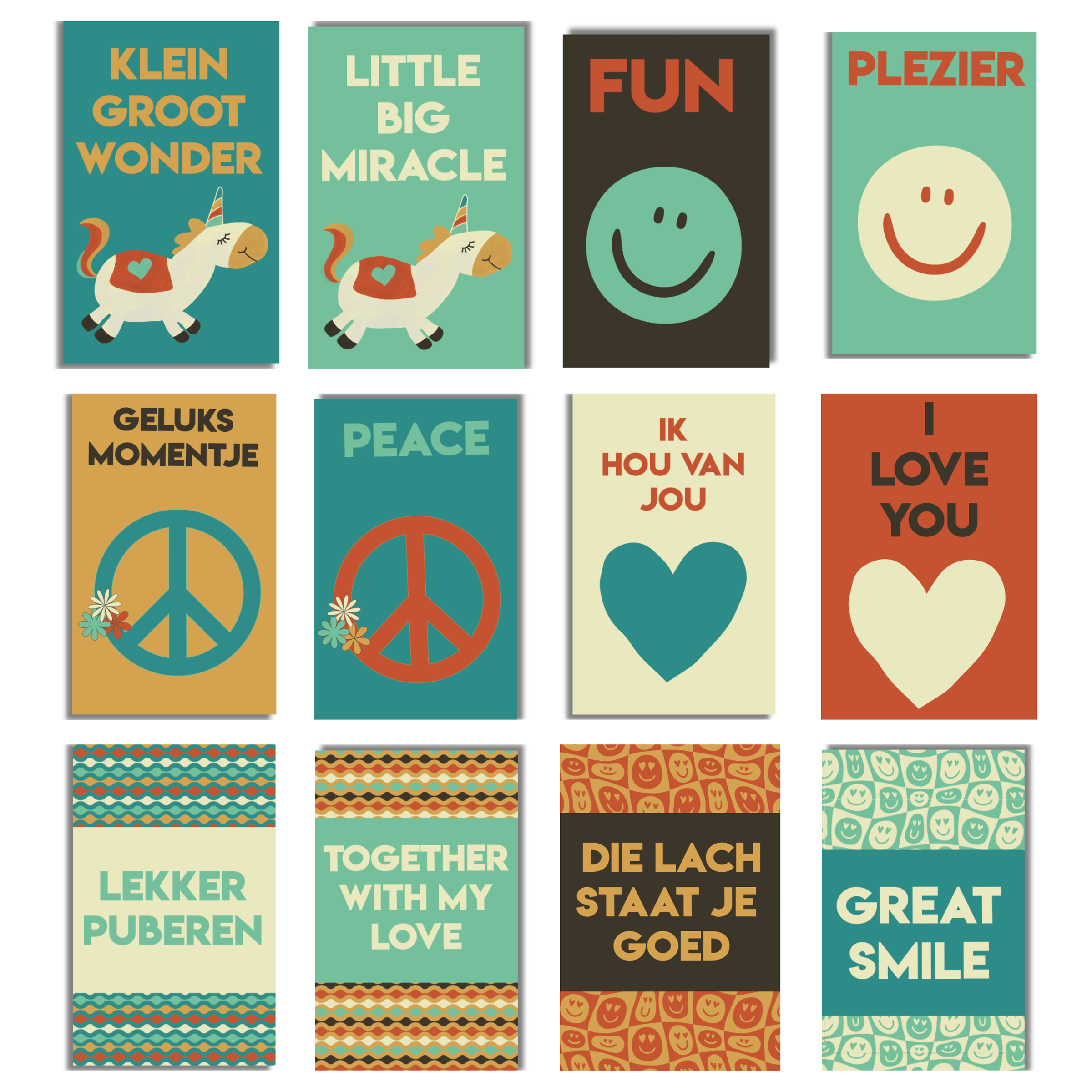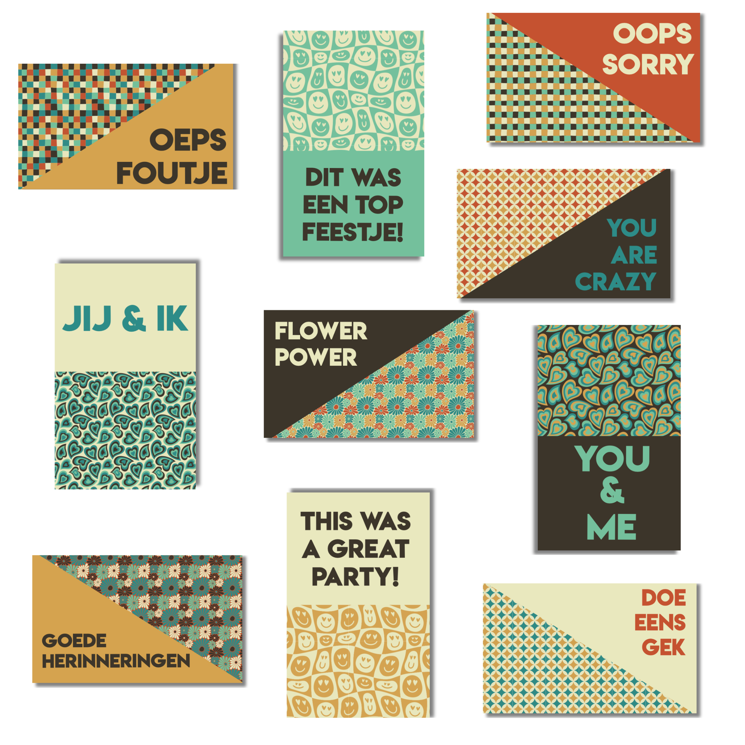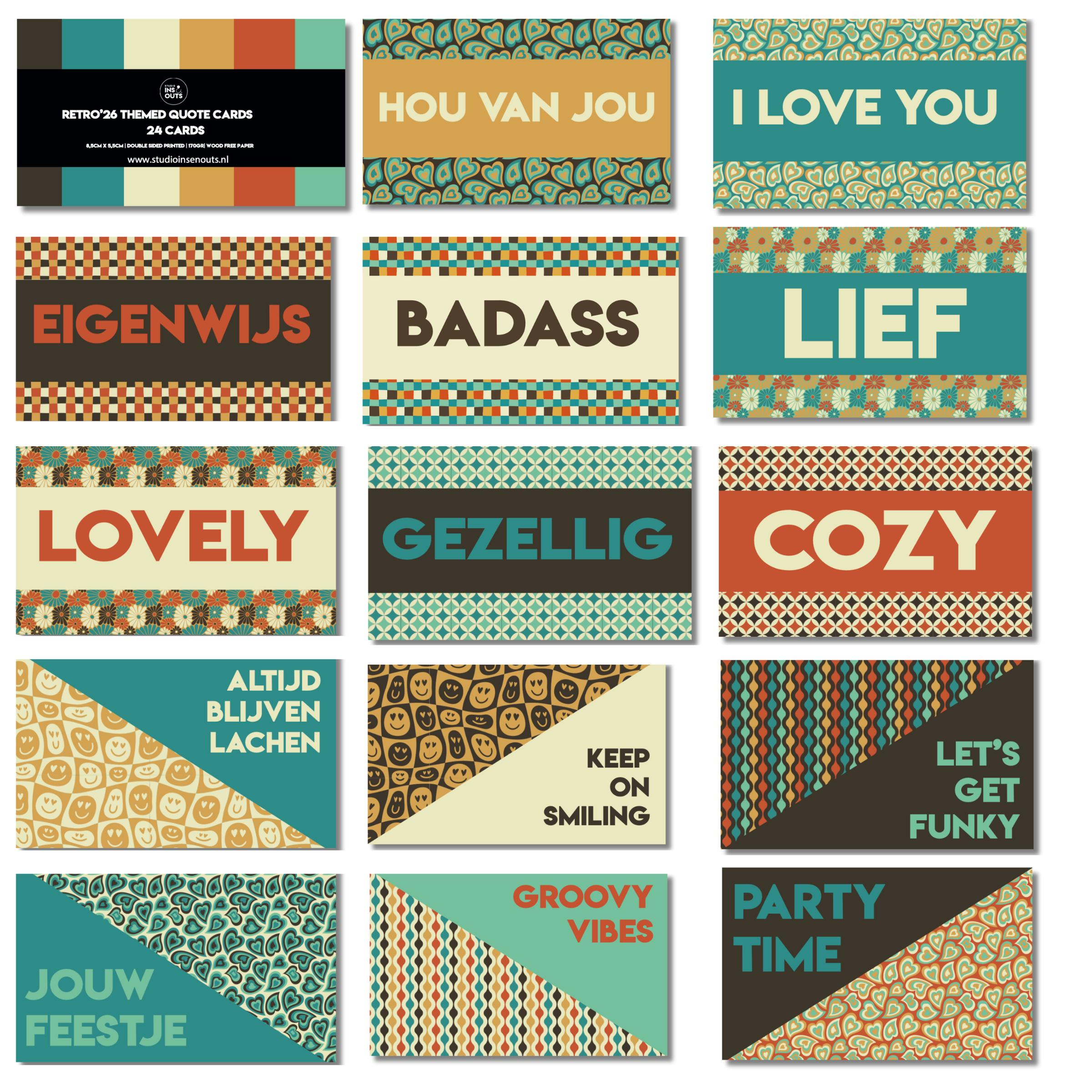 De Retro ’26 collectie bestaat uit warme retro kleuren zoals donkerbruin, petrol, crème, okergeel, terracotta en mintgroen. De patronen die je terugvindt zijn smileys, hartjes, bloemenprints, geometrische vormen, golvende lijnen en grafische retro dessins. Deze combinatie zorgt voor een herkenbare stijl die goed werkt bij foto’s, korte teksten en labels.