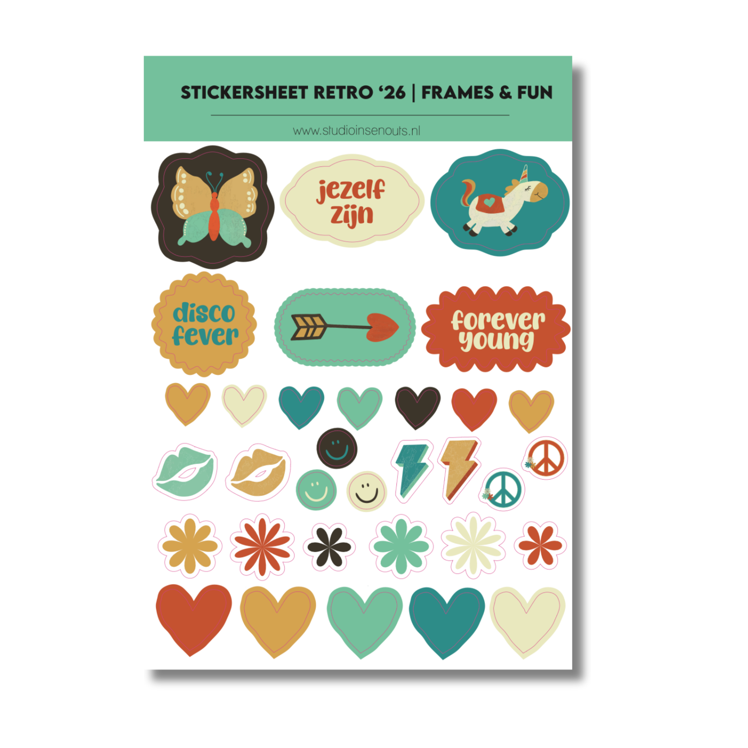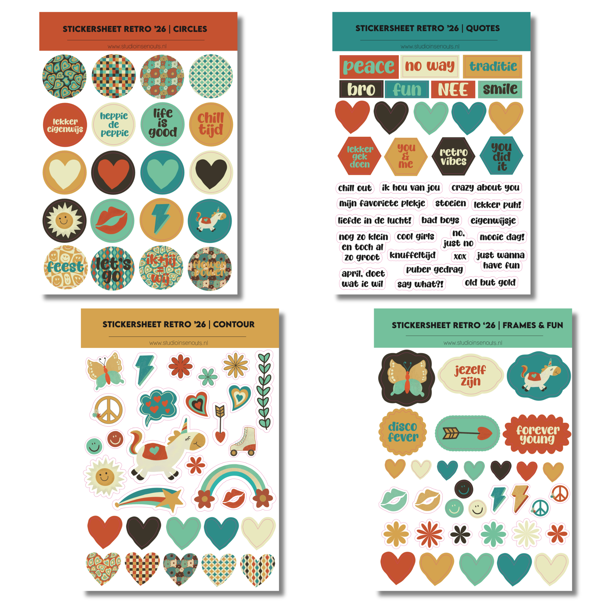 Stickervellen: 4 vellen (circles, quotes, contour en frames & fun) met smileys, hartjes, labels, woorden en illustraties die aansluiten bij het retro thema.