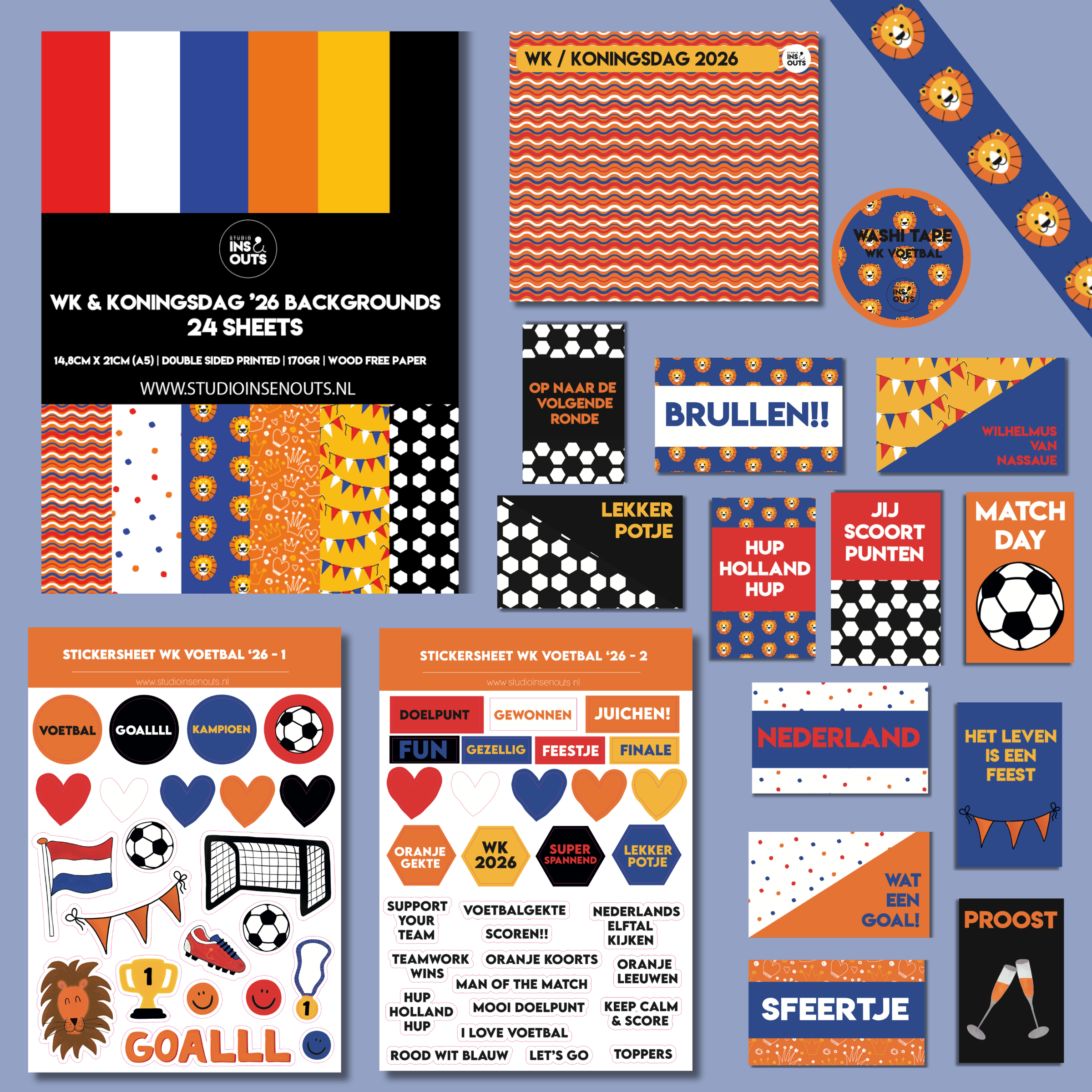 De set heeft een herkenbare Nederlandse uitstraling met leeuwtjes, vlagkleuren, confetti en grafische prints. Hierdoor maak je eenvoudig layouts rondom WK 2026, voetbalmomenten en sportieve herinneringen. De combinatie van designpapier, voetbal stickers en tekstkaartjes zorgt voor een duidelijke en samenhangende pagina-opbouw.