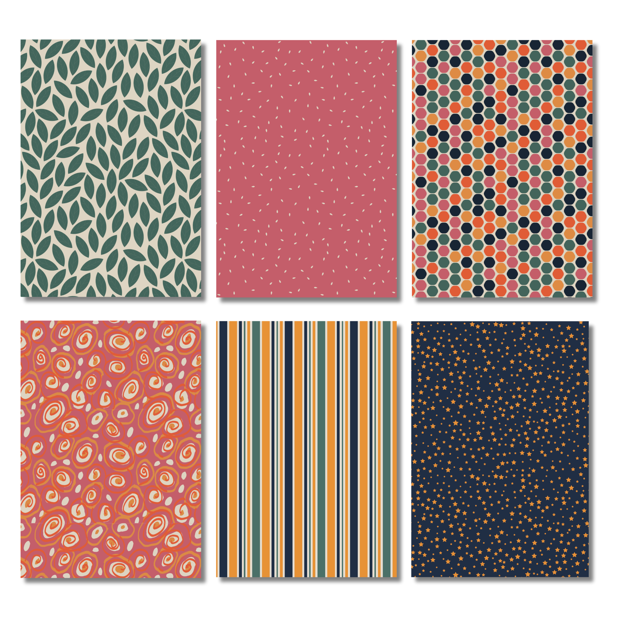Paperpad: 24 dubbelzijdige vellen (14,8 × 21 cm) met frisse patronen zoals hexagons, bladeren, strepen, confetti en vrolijke swirl-prints in krachtige kleurcombinaties.