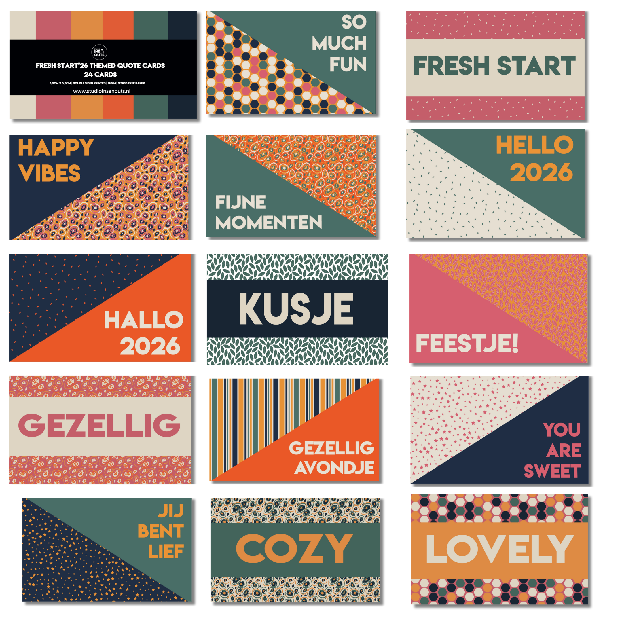 Quote kaartjes: 24 kaartjes (6,4 × 9 cm) met korte nieuwjaarsquotes zoals “Fresh Start”, “Happy Vibes”, “Hello 2026” en “Fijne momenten”.