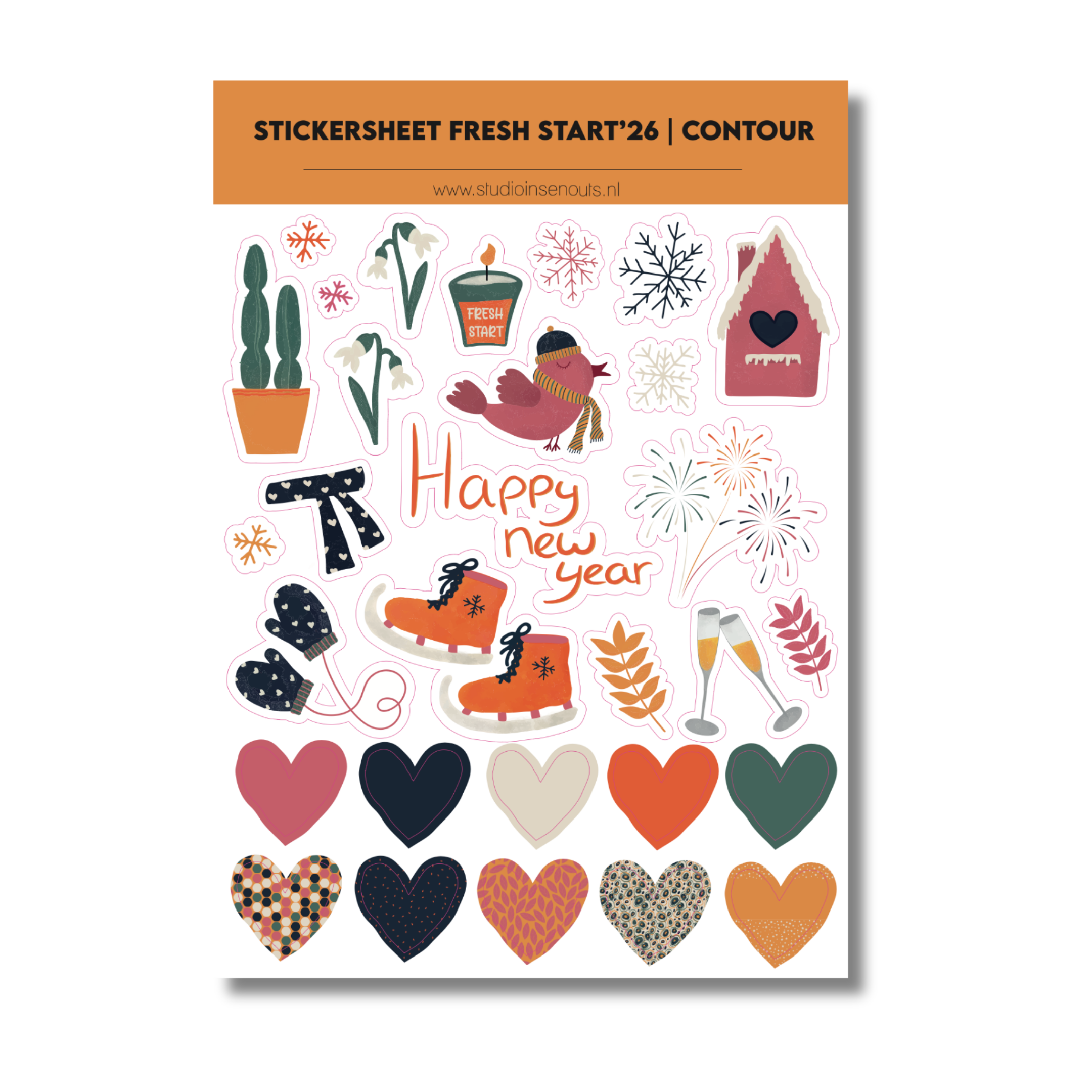 Stickervellen: 4 vellen (circles, quotes, contour en frames) met nieuwjaarsiconen, winterdetails, hartjes, sterren, skates, planten en positieve teksten.