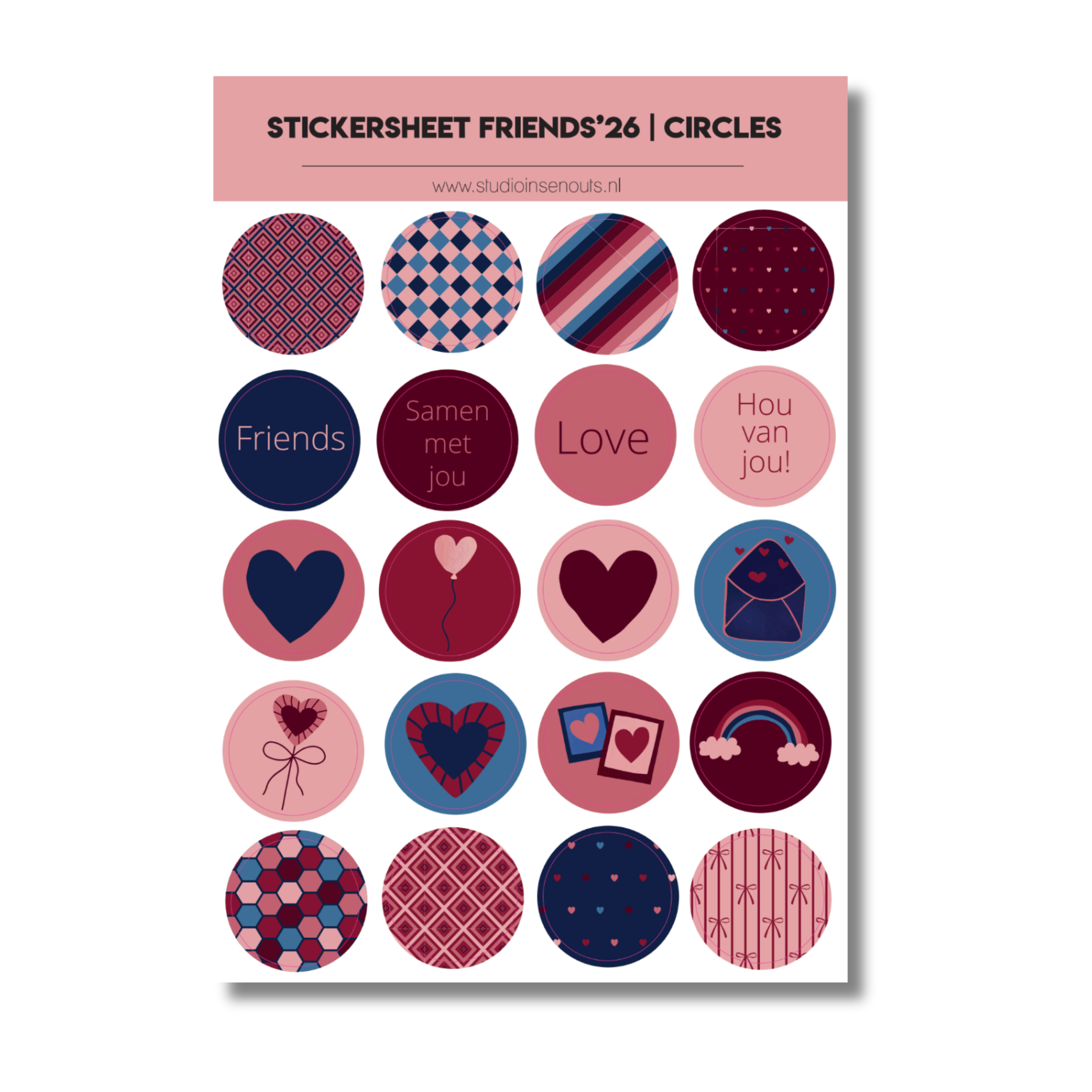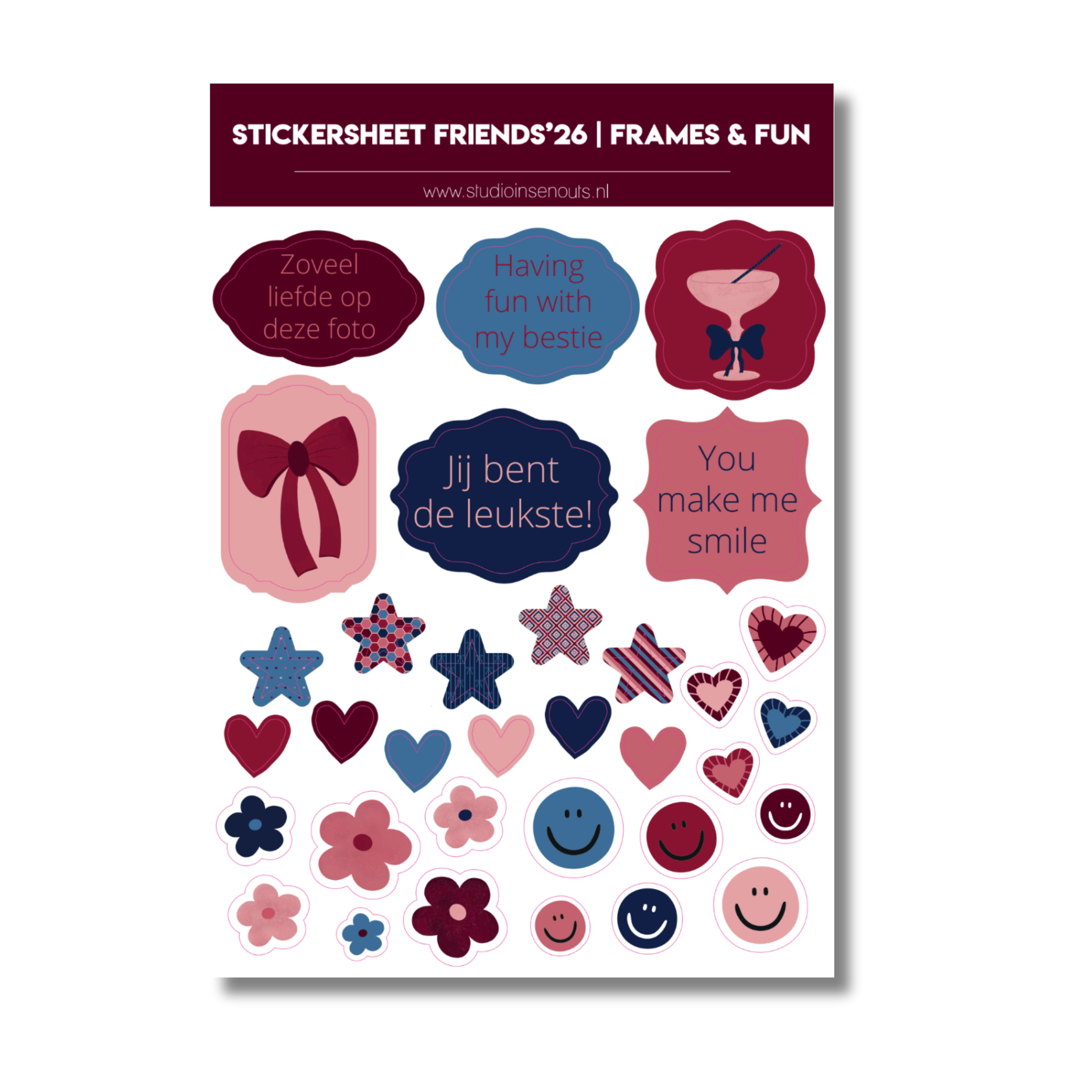De Friends’26 collectie van Studio Ins & Outs is een compleet scrapbook pakket voor het vastleggen van momenten met vrienden en mensen die belangrijk voor je zijn. Deze set is samengesteld voor pagina’s over vriendschap, samen leuke dingen doen, herinneringen maken en dagelijkse momenten. De collectie bevat een paperpad, stickers, washi tapes en kaartjes in een herkenbaar kleurenpalet van lichtroze, oudroze, rood, bordeaux, blauw en donkerblauw. Geschikt voor scrapbooking, journaling, invulboeken en fotoboeken.