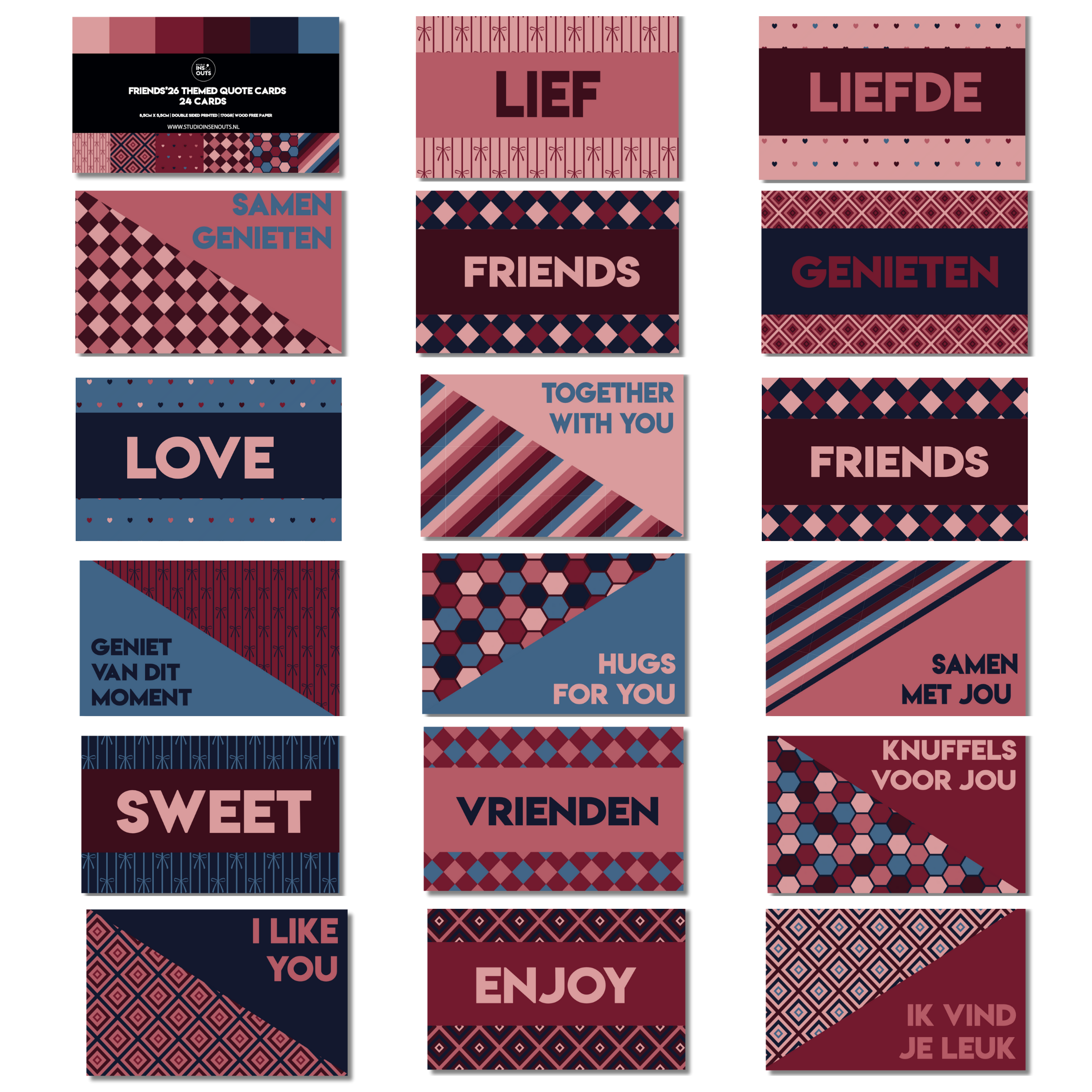 De Friends collecties bestaat uit de volgende kleuren: lichtroze, oudroze, rood, bordeaux, blauw en donkerblauw. De patronen die je terugvindt zijn hexagon, hartjes, ruitjes, hokjes, strepen en strikjes.