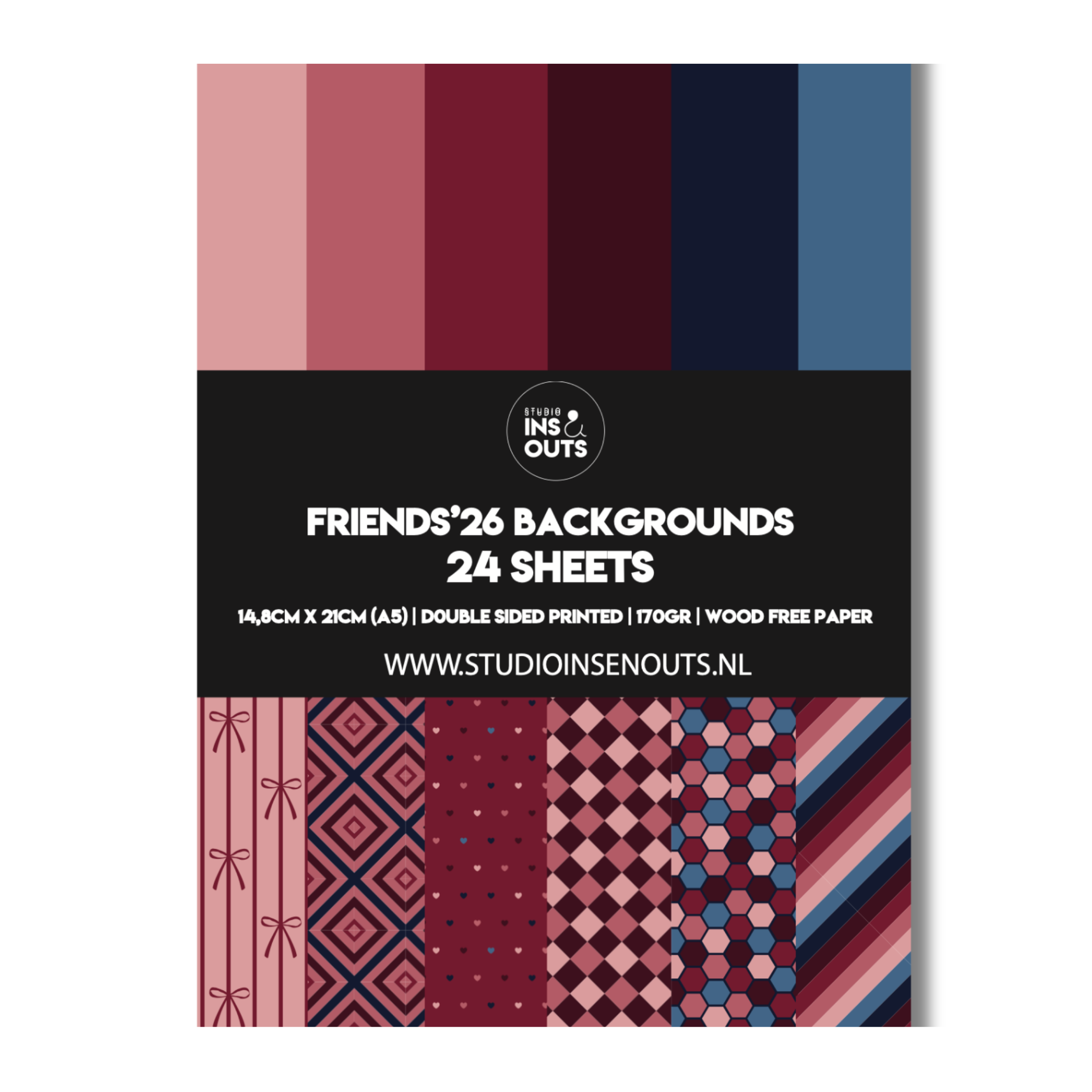 - Paperpad: 24 dubbelzijdige vellen (14,8 × 21 cm) met patronen zoals hartjes, ruiten, hexagon, strikjes, strepen en hokjes in het Friends’26 kleurenpalet.