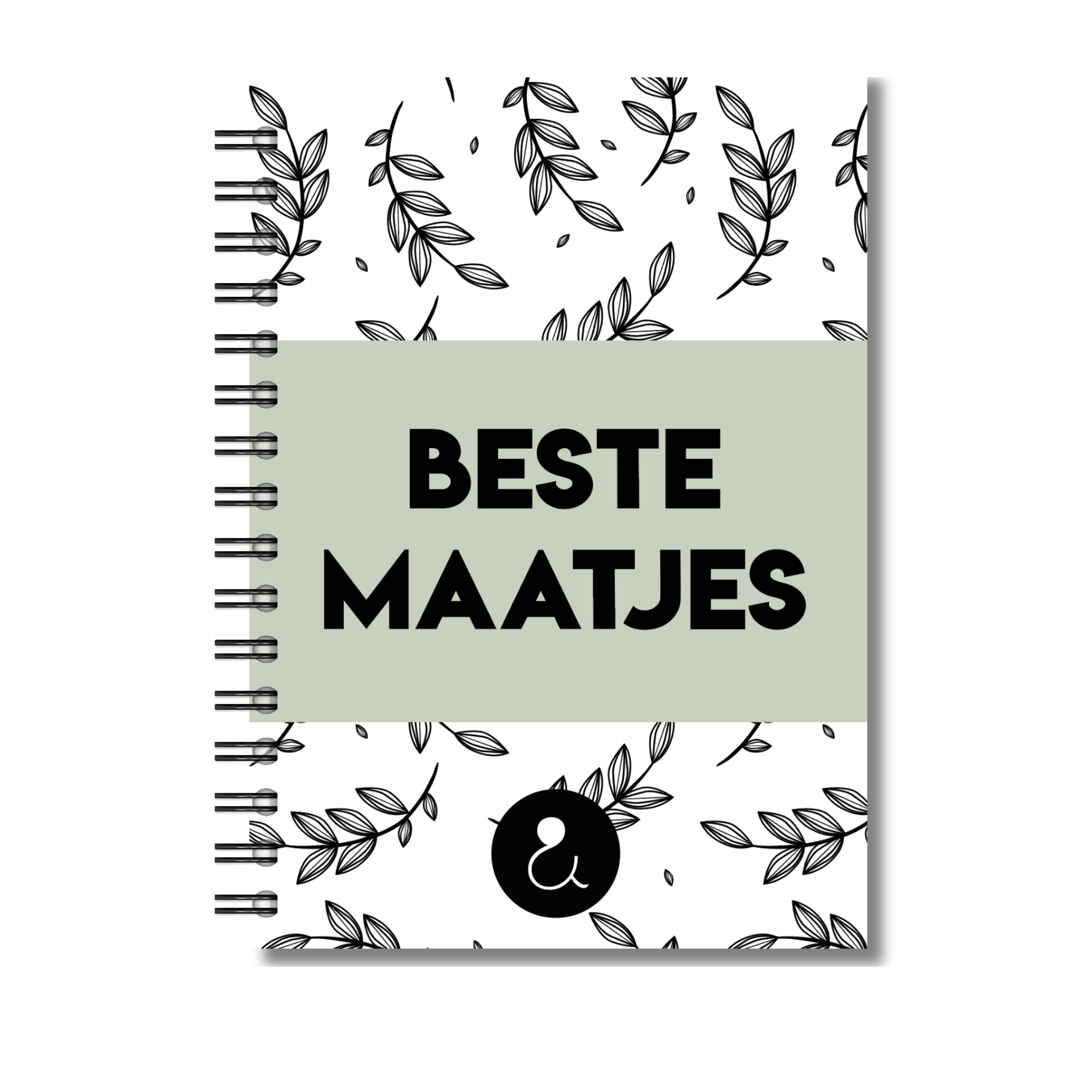 - Omslag: Botanical blaadjes print met sandkleurige band en tekst 'Beste Maatjes'