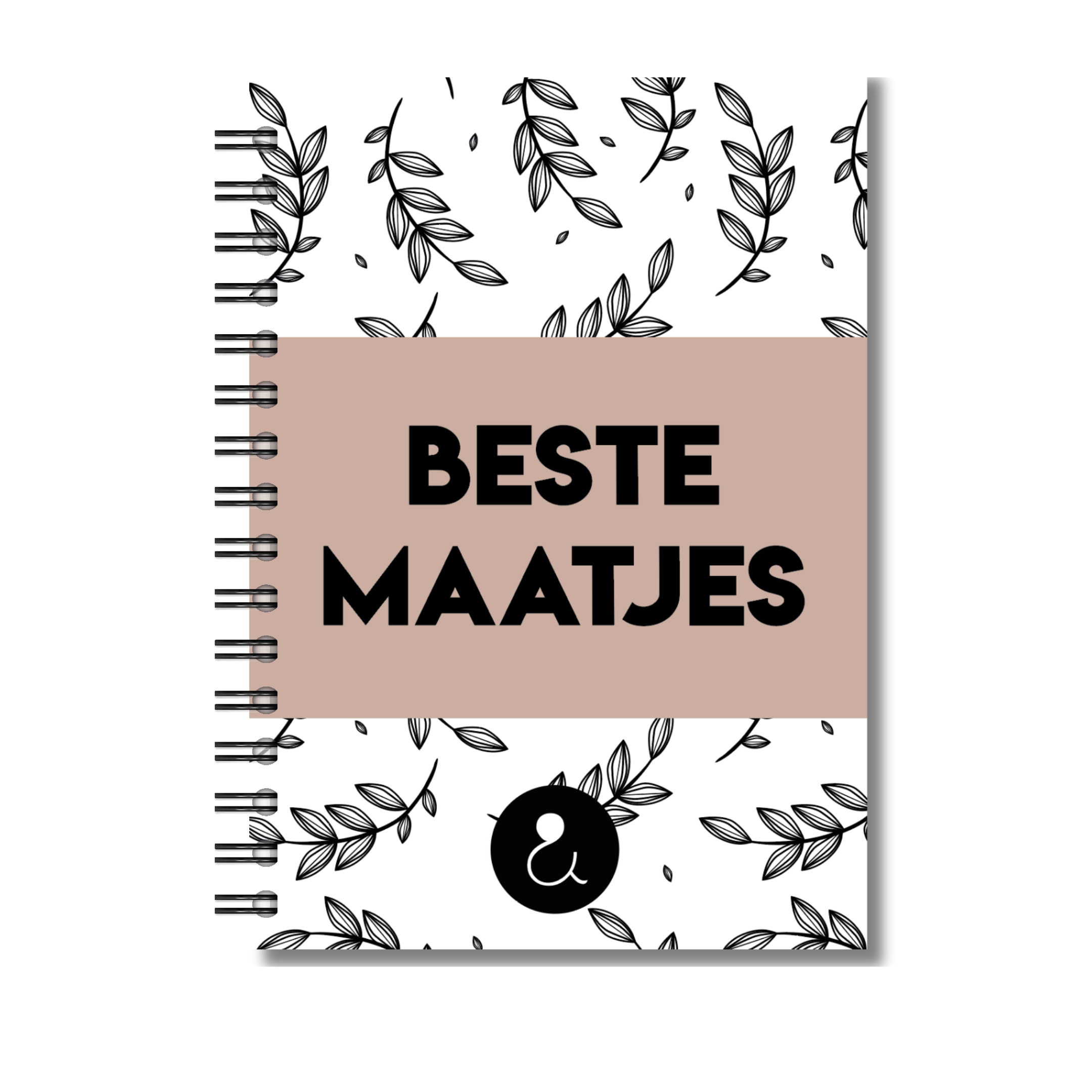- Omslag: Botanical blaadjes print met sandkleurige band en tekst 'Beste Maatjes'