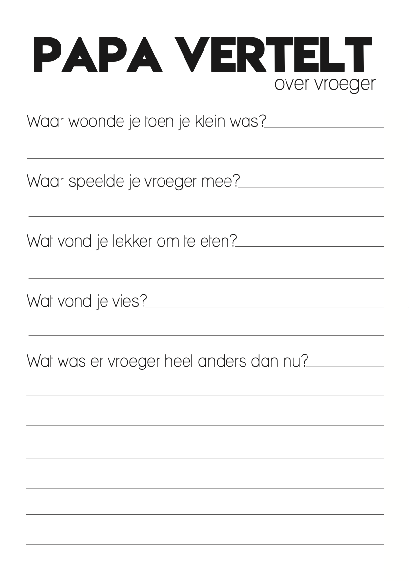 - Vragen aan papa en mama over vroeger, hun dromen en favoriete herinneringen – waardevol om later terug te lezen