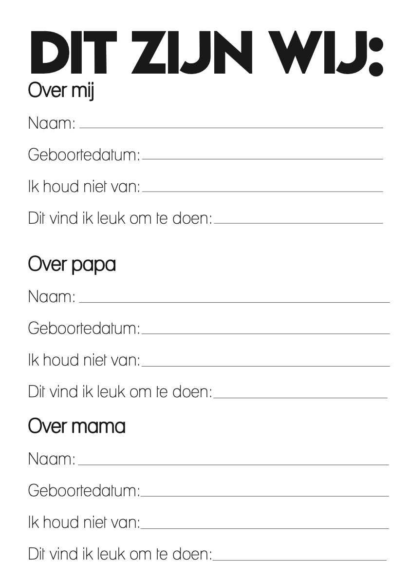- Voorin ruimte om jullie voor te stellen: een stukje over papa, een stukje over mama en een stukje over hun kind