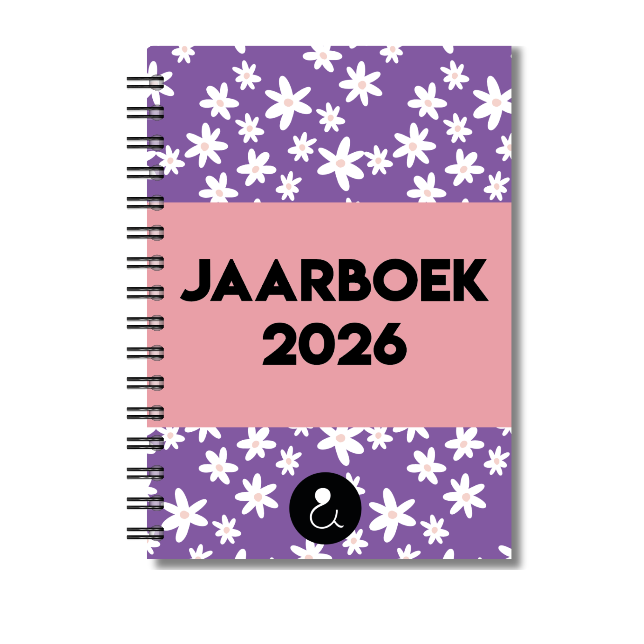 Jaarboek 2026 A5 | Blanco Jaarboek A5 2026 | Fotoboekje Jaarboek | 14,8x21cm | Paars Met Witte Bloemetjes