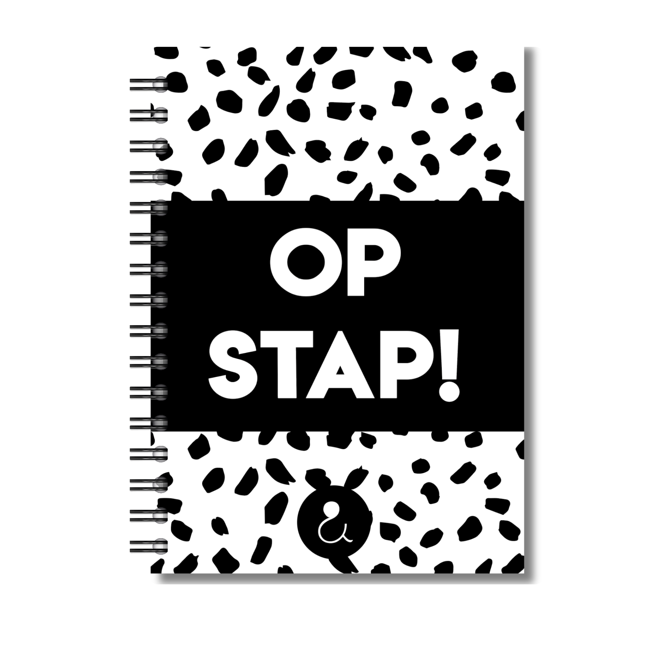 - Omslag: Dots stippen print met zwarte band met de tekst 'Op Stap'