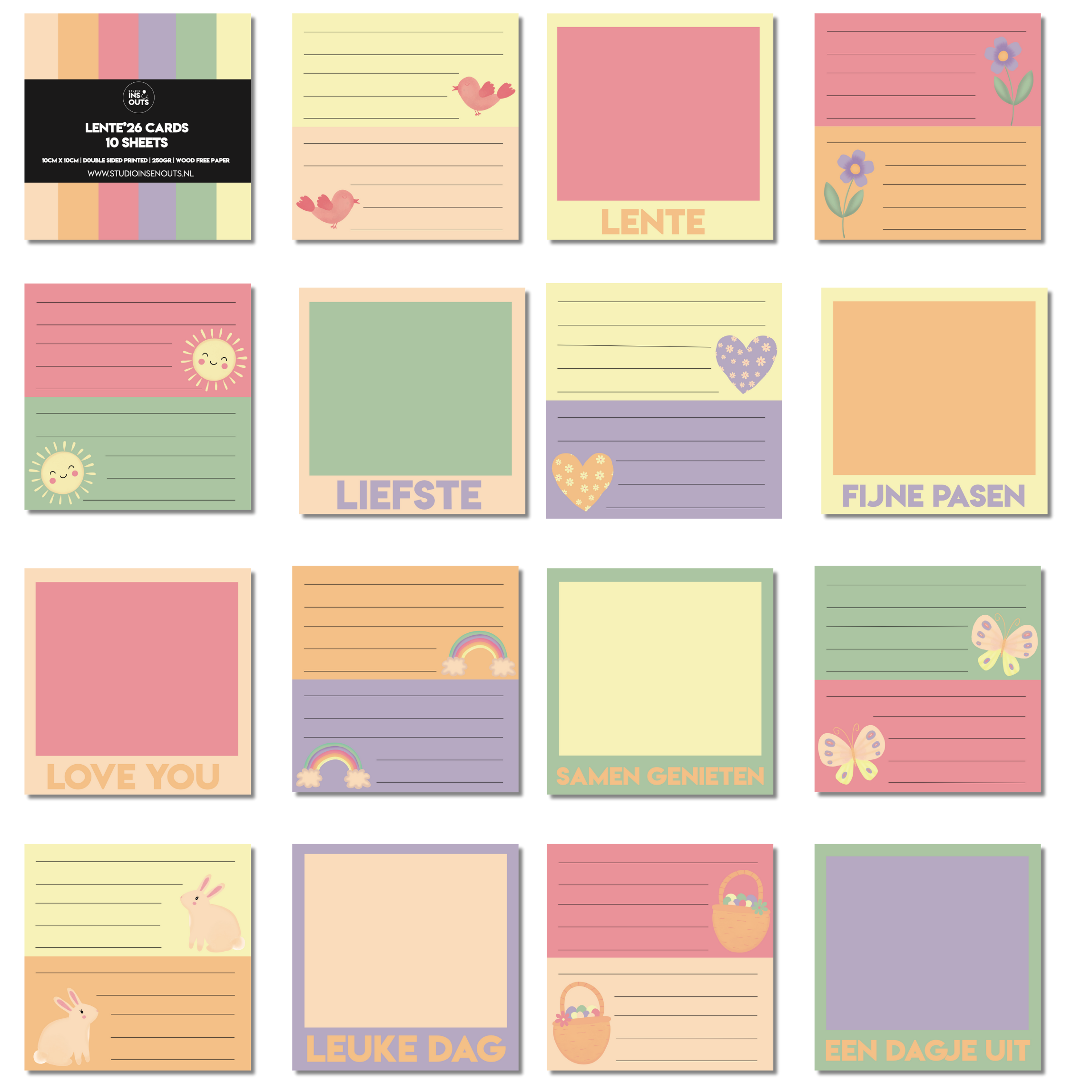 De kaartjes bevatten korte teksten zoals “LENTE”, “LIEFSTE”, “LOVE YOU”, “FIJNE PASEN”, “SAMEN GENIETEN”, “LEUKE DAG” en “EEN DAGJE UIT”. Elke kaart is dubbelzijdig bedrukt. Eén zijde heeft schrijflijntjes met kleine illustraties voor het noteren van een datum of korte tekst. De andere zijde heeft een polaroid-vlak voor een foto of notitie. Hierdoor zijn de kaartjes geschikt voor het vastleggen van Paasdagen, lente-uitjes en gezinsmomenten.