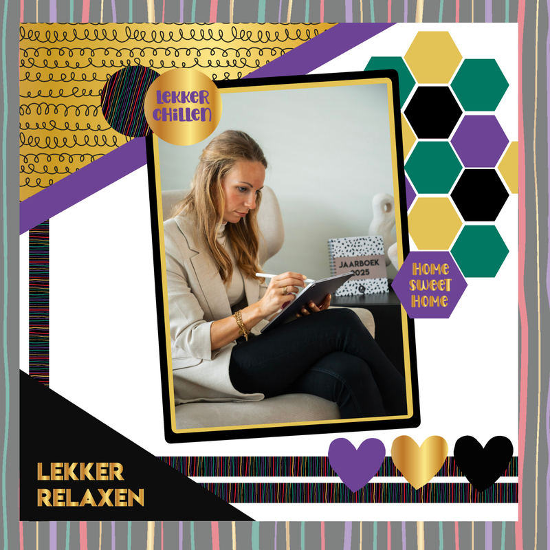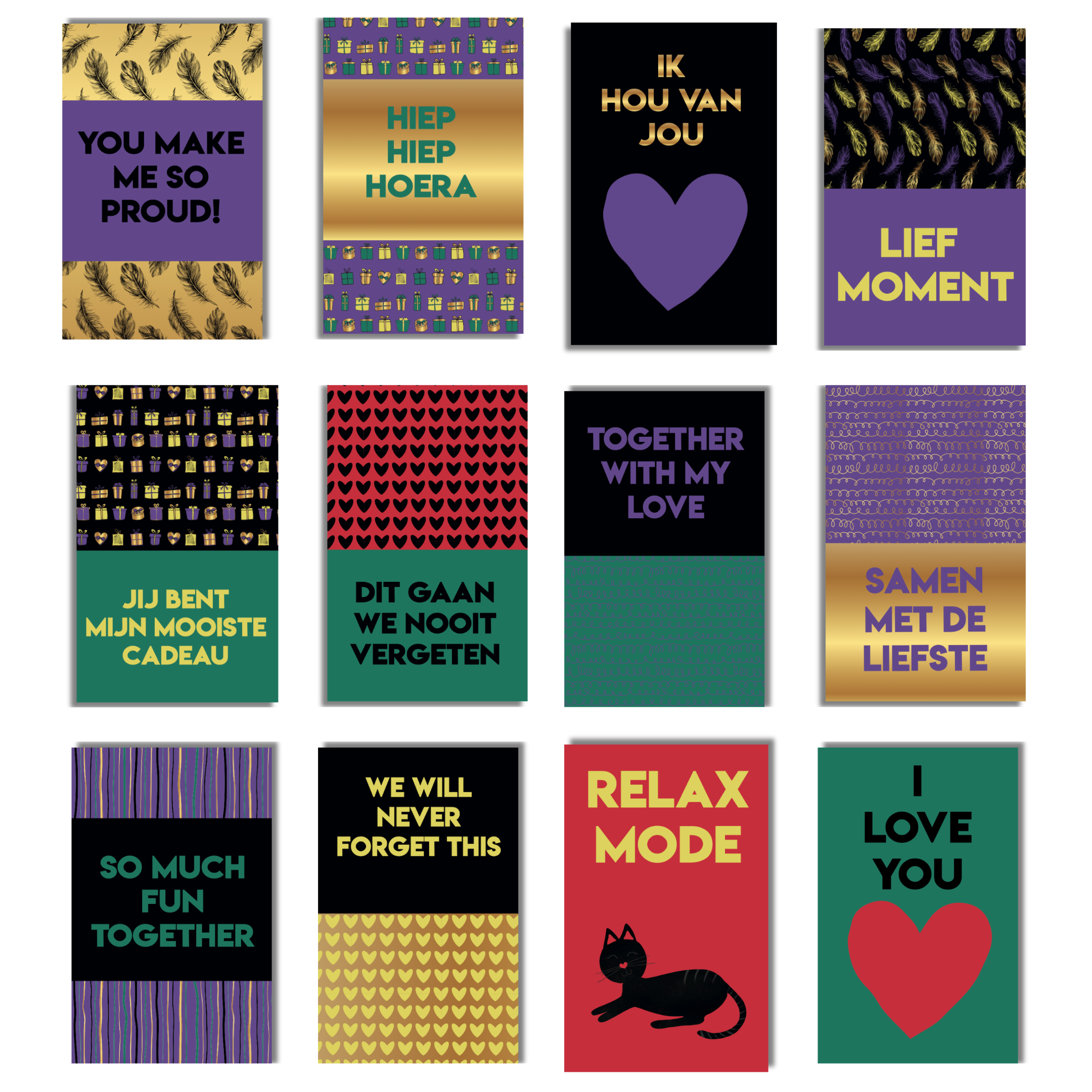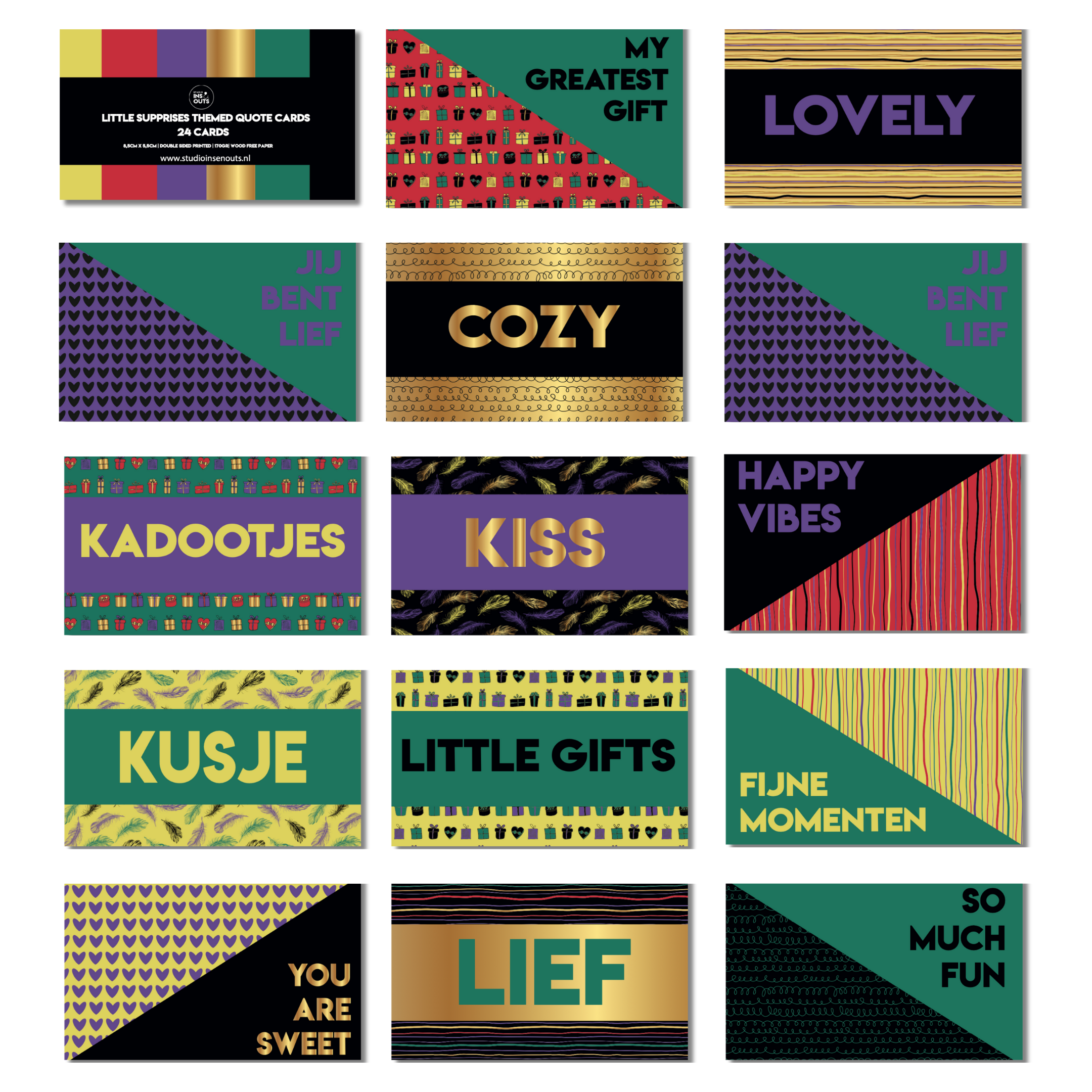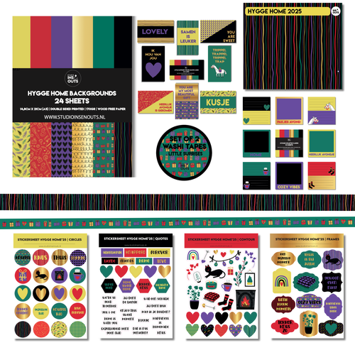 De Hygge Home quote kaartjes van Studio Ins & Outs brengen warmte, gezelligheid en knusse sferen in jouw creatieve scrapbook, journal of plakboek projecten. Deze set van 24 kaartjes is uitgevoerd in diepe kleuren zoals groen, paars, zwart en goud, en bevat een mix van vrolijke prints met hartjes, veren, cadeautjes, verticale lijnen, spiraal lijnen en een toffe Sinterklaas print! Ideaal om een persoonlijk accent toe te voegen aan je scrapbook, journal of fotoboek.