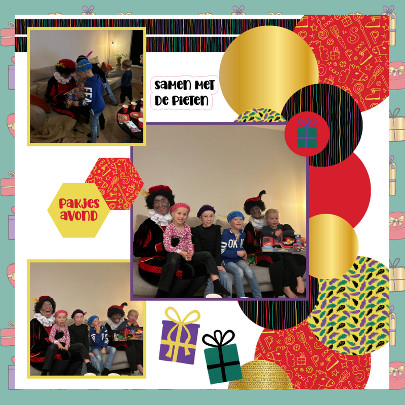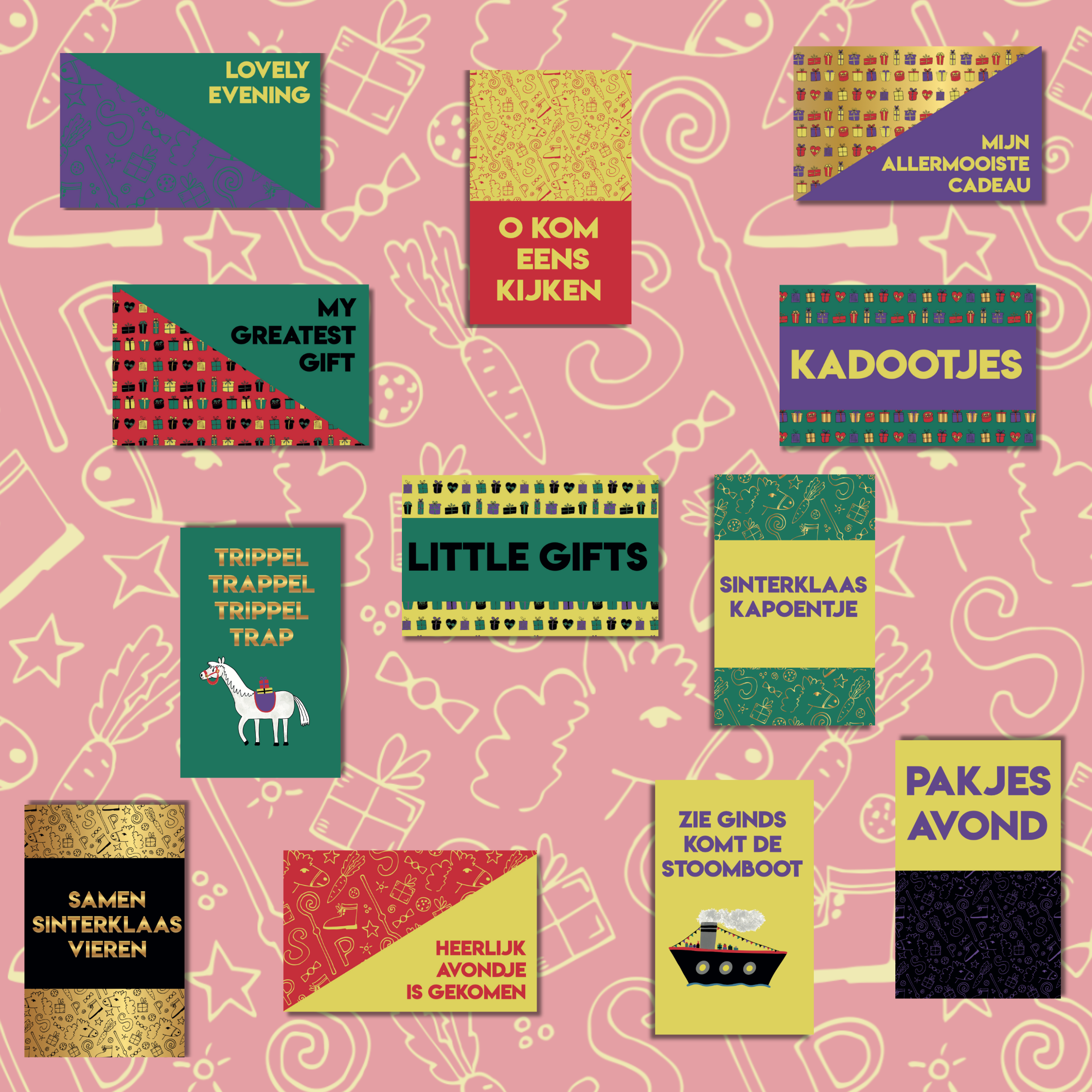 - Designs met hartjes, veren, cadeautjes en verticale lijnen, spiraal lijnen en sinterklaas print