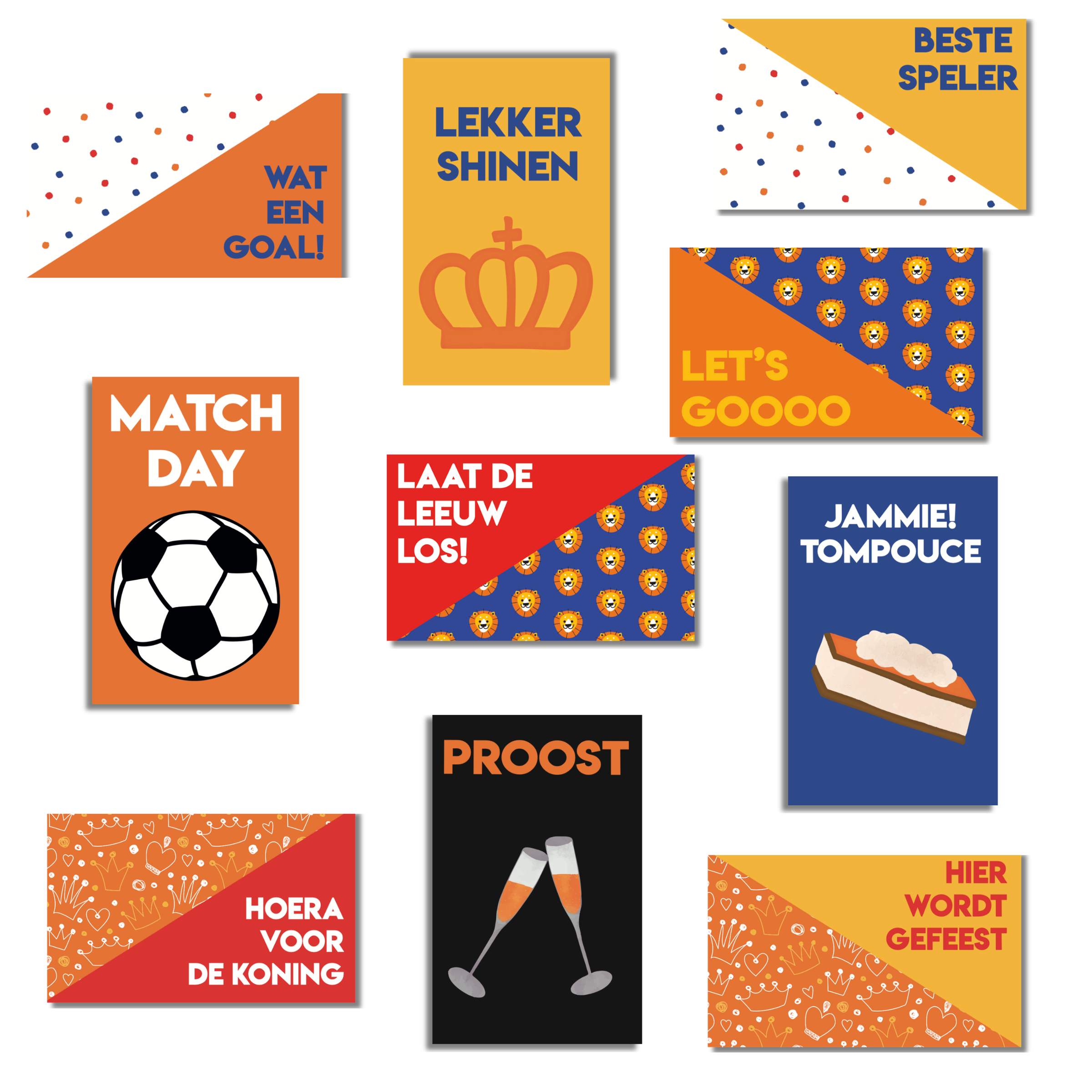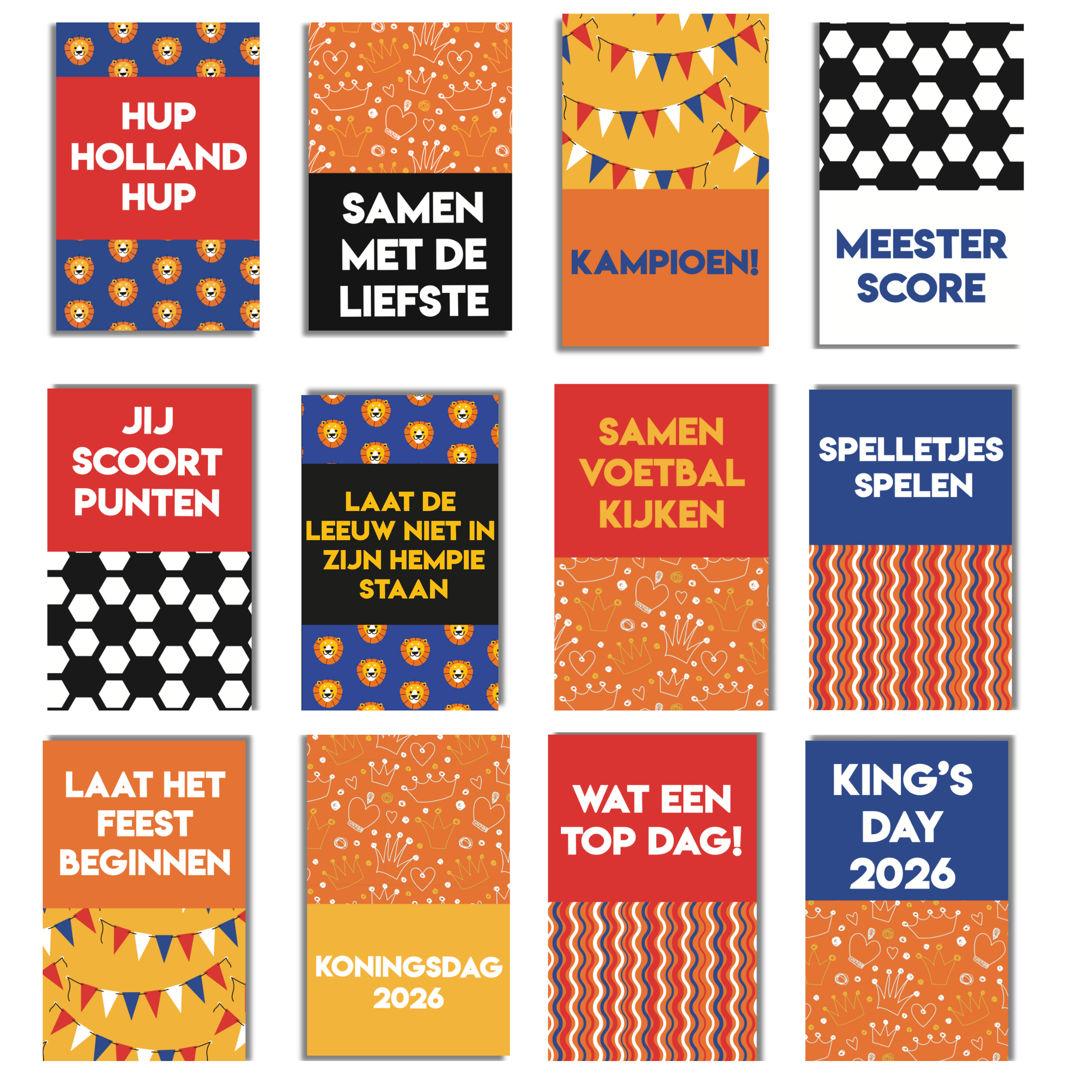 De set bevat een mix van tekstkaartjes en kaartjes met patronen zoals leeuwtjes, vlaggetjes, kroontjes, confetti en een voetbalpatroon. Door de duidelijke typografie en contrastrijke kleuren zijn de kaartjes goed zichtbaar op je pagina. Je kunt ze los gebruiken of combineren met foto’s, stickers en designpapier in je scrapbook, journal of fotoboek.