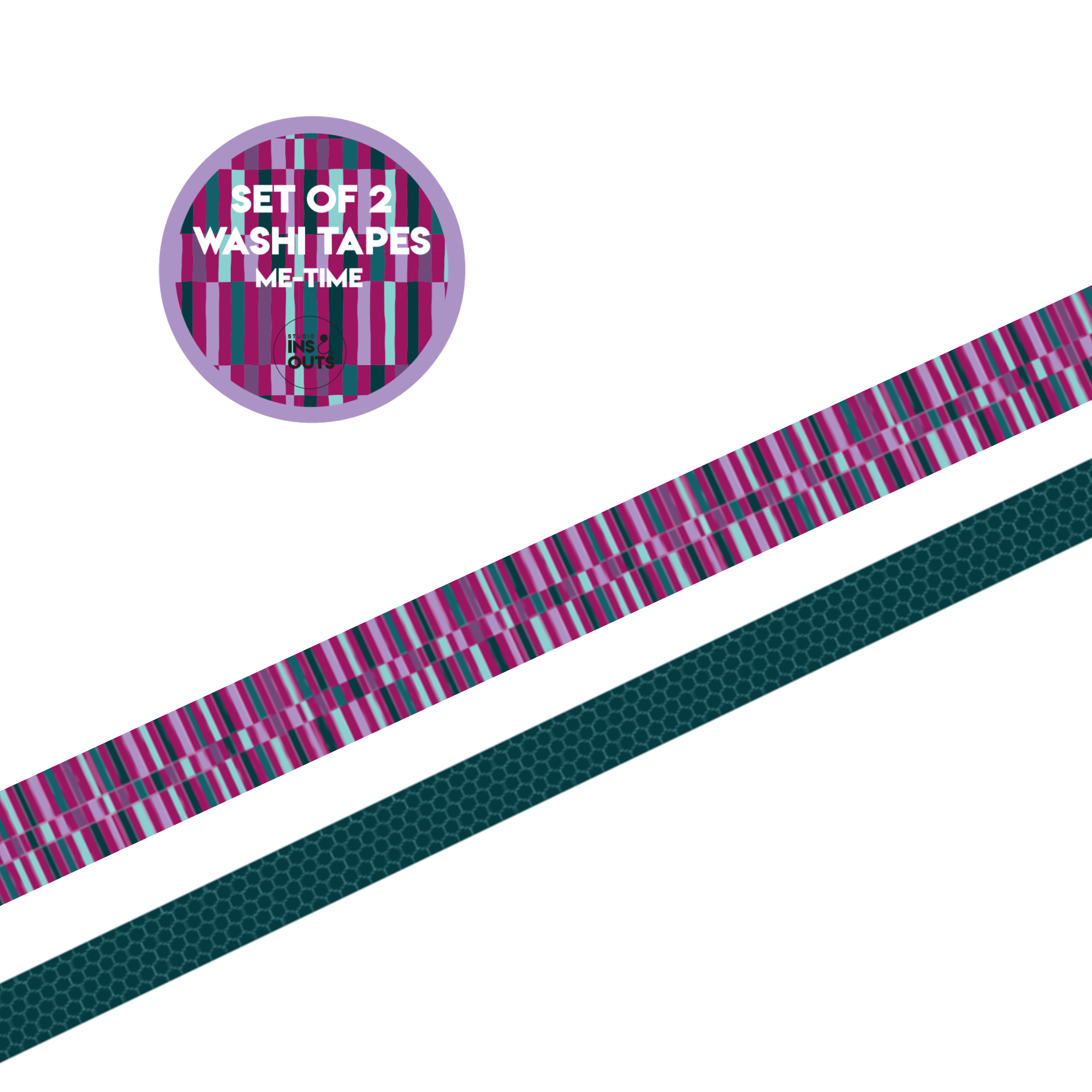 De set bevat twee washi tapes: een brede tape met een modern strepenpatroon in paars, bordeaux en mintgroen, en een smalle tape met een petrolgroen honingraatpatroon. Ze zijn ideaal om spreads te omlijnen, accenten aan te brengen of je journalingpagina een speelse finishing touch te geven.