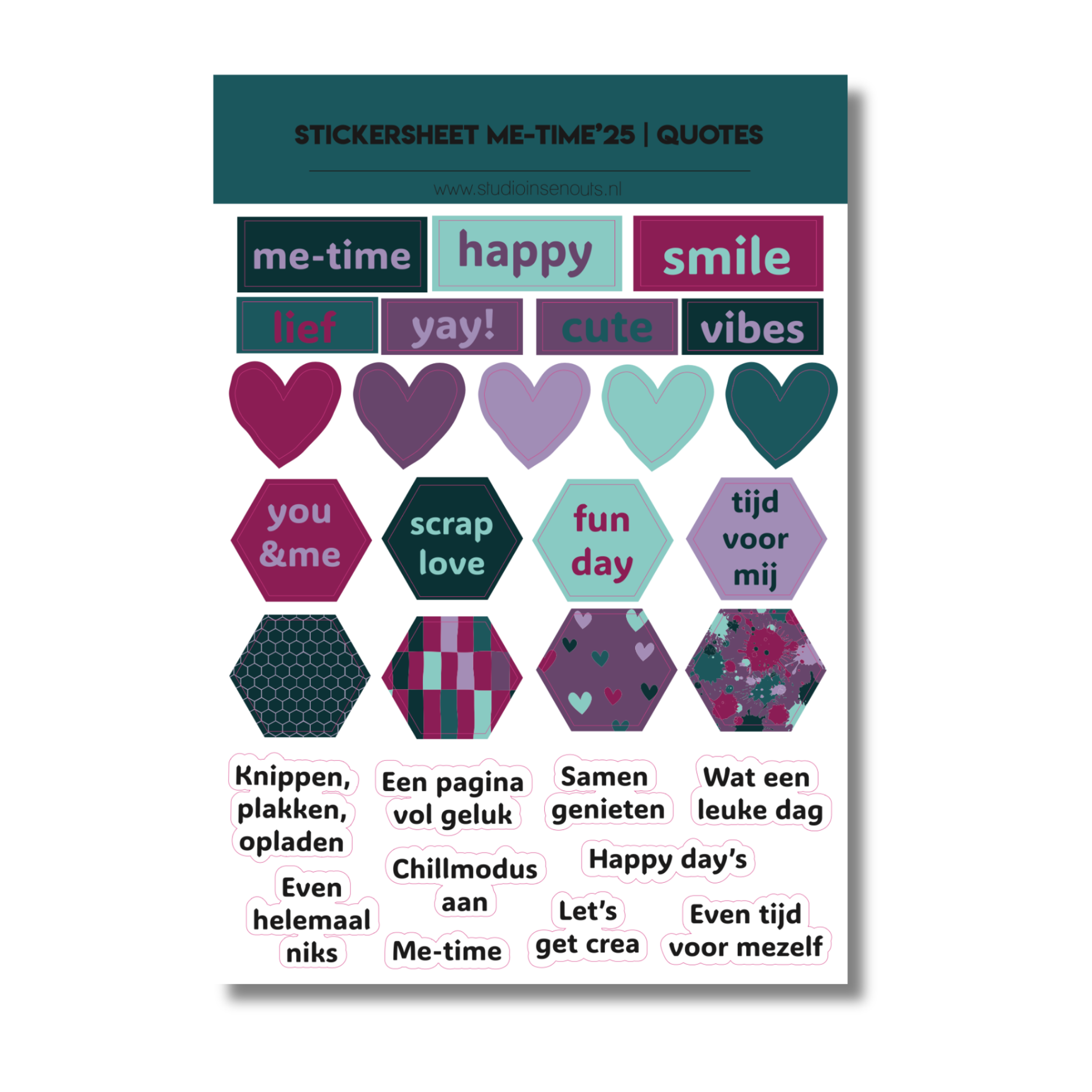 Het Stickervel Quotes Me-Time’25 van Studio Ins & Outs is speciaal ontworpen om je creatieve projecten een persoonlijke en ontspannen touch te geven. Het vel bevat 30 unieke tekststickers en quotes in de kleuren paars, lila, bordeaux, mintgroen, donkergroen en petrol groen. Met teksten zoals “me-time”, “tijd voor mij”, “chillmodus aan” en “let’s get crea” breng je eenvoudig extra sfeer in je scrapbook, fotoboek of journal. Ideaal om jouw creatieve momenten vast te leggen en te benadrukken.