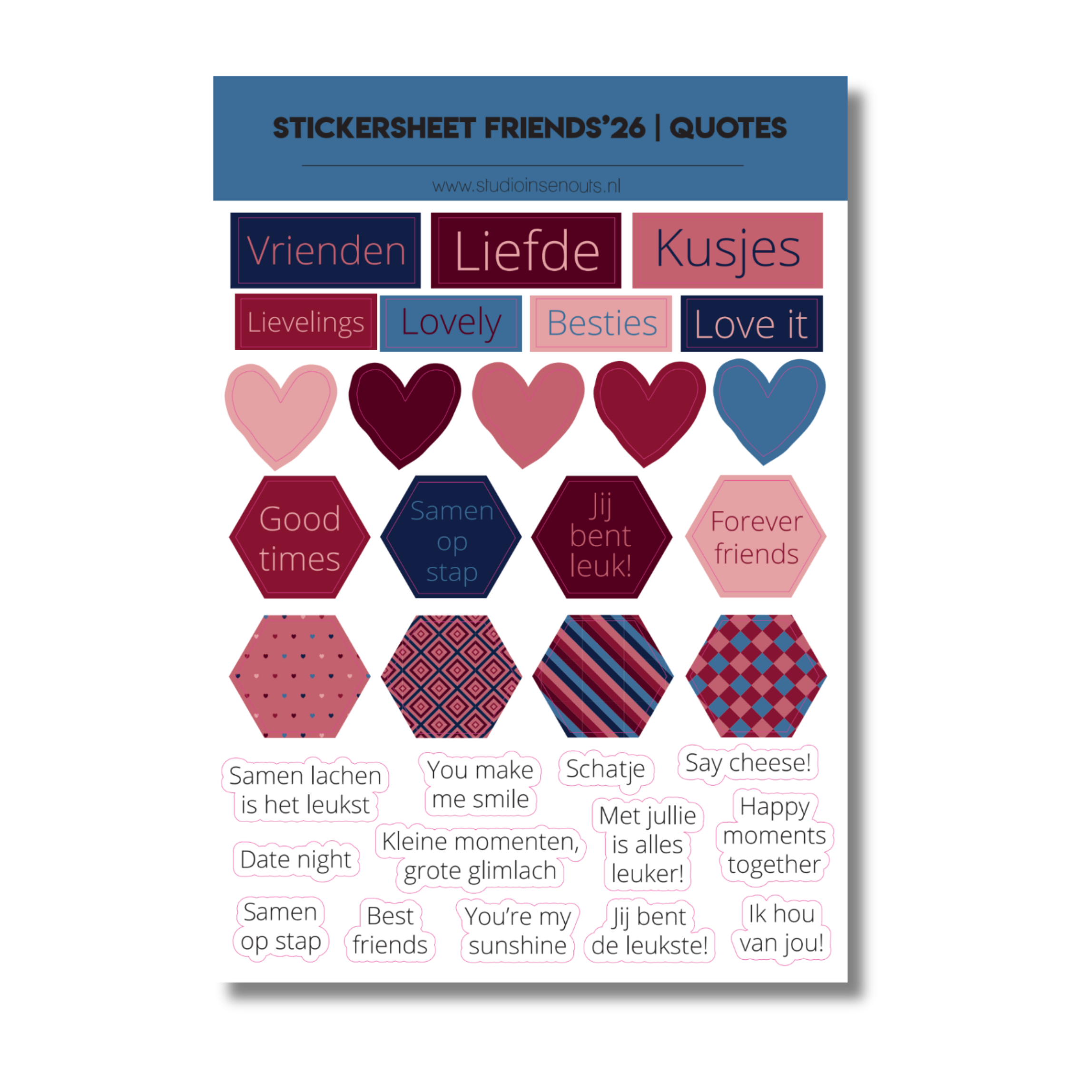 Het Stickervel Quotes Friends’26 van Studio Ins & Outs bestaat uit tekststickers met korte quotes over vriendschap. De stickers zijn geschikt voor plakboeken, invulboeken, fotoboeken, planners en journals. Door de korte en duidelijke teksten voeg je eenvoudig een titel, toelichting of extra detail toe aan je pagina’s.