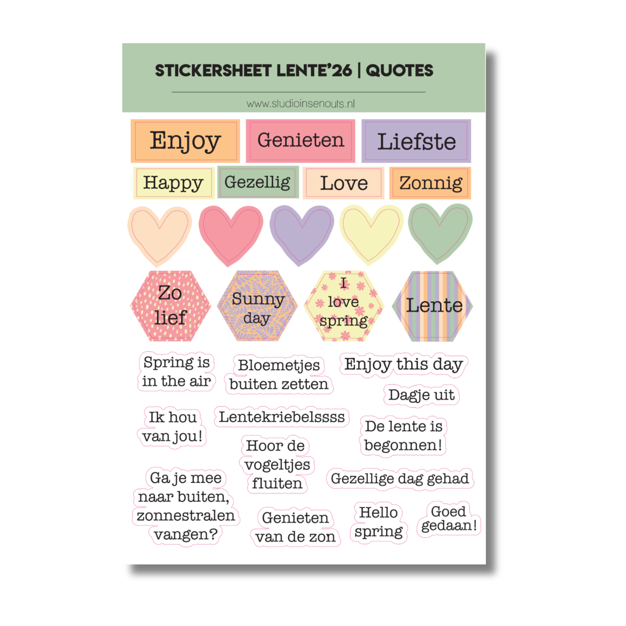 Het stickervel Quotes Lente’26 is ontwikkeld voor gebruik in invulboeken en fotoboeken van Studio Ins & Outs, maar is ook geschikt voor andere scrapbook projecten. De stickers kun je goed combineren met de bijpassende paperpad, stickervellen lente, quote kaartjes, polaroidkaartjes en washi tapes uit de Lente’26 collectie of de stickervellen Pasen en washi tape uit de Pasen'26 collectie.